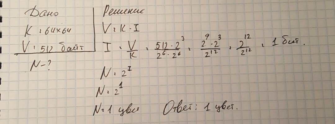 Для хранения растрового изображения размером 64х64 пикселей отвели 512 байтов памяти. Каково максимально возможное число цветов в палитре изображения?