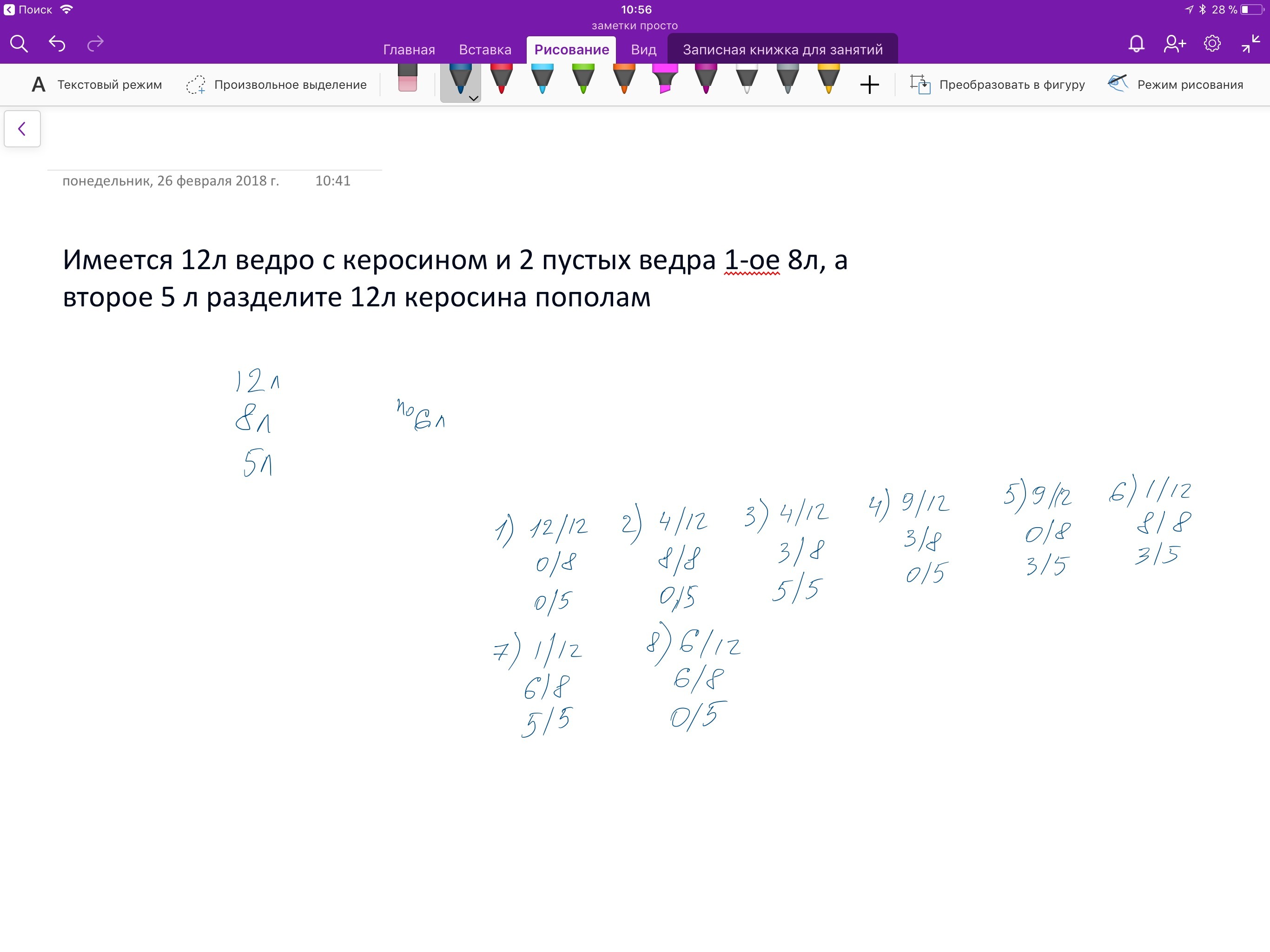 имеется 12л ведро с керосином и 2 пустых ведра 1-ое 8л, а второе 5 л разделите 12л керосина пополам
