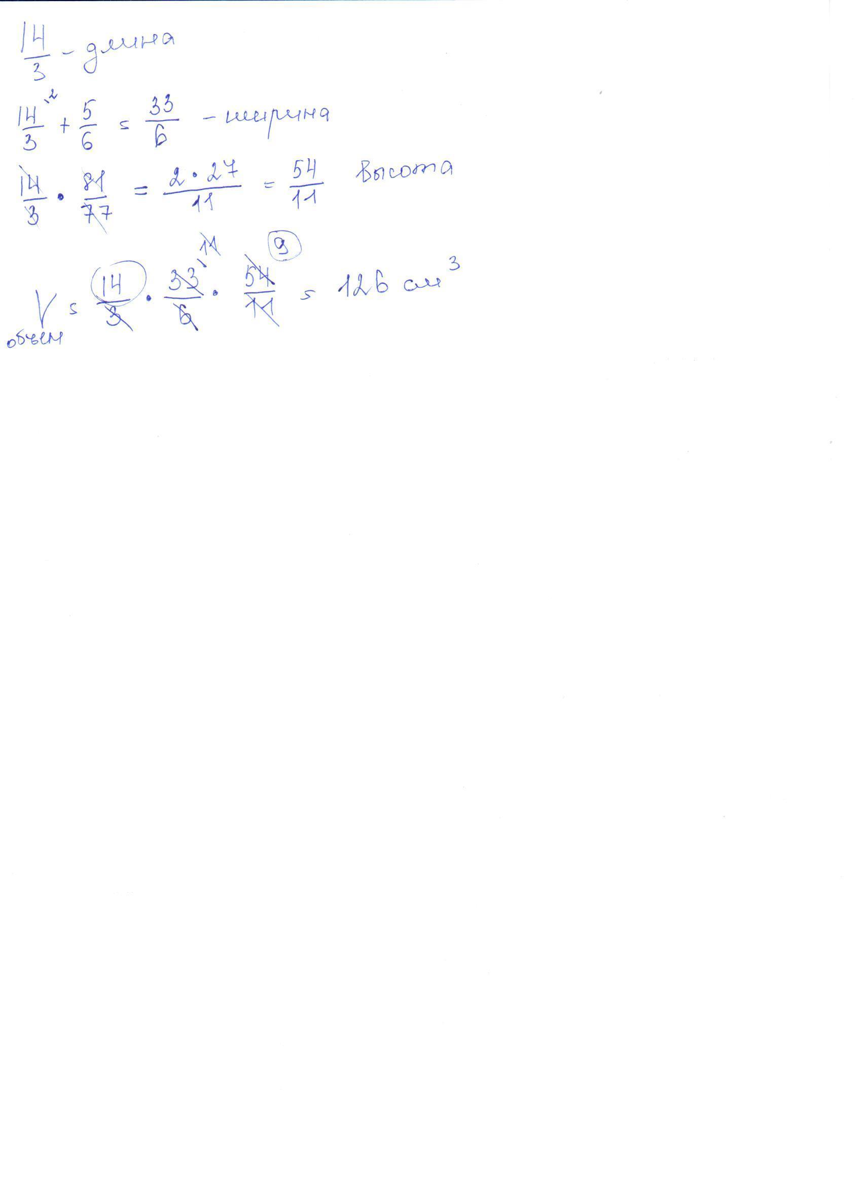 Длина прямоугольного параллелепипеда равна 4 2/3 см, что на 5/6 см меньше его ширины и в 1 4/77 раза меньше высоты. Найдите объём параллелепипеда.