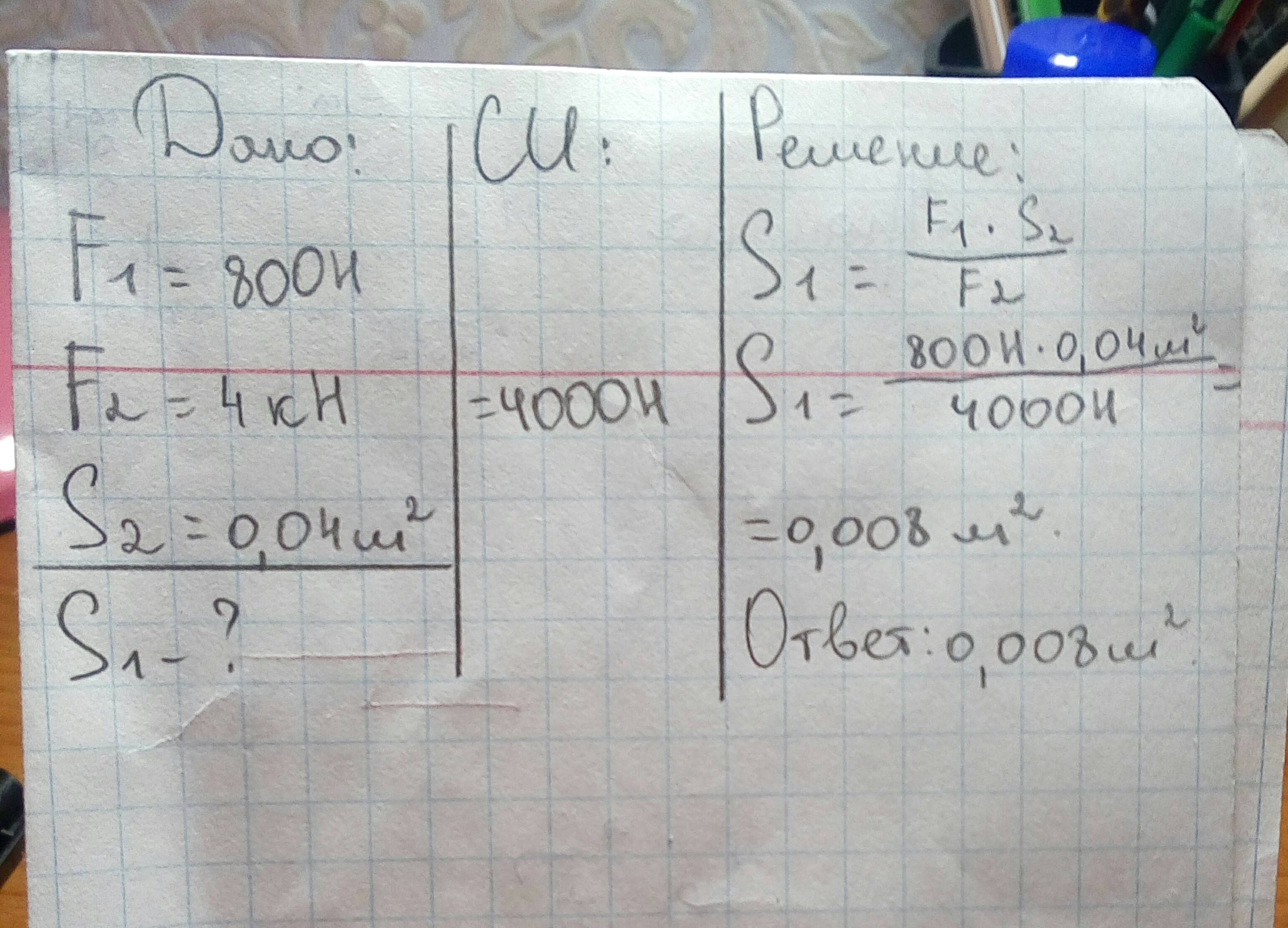 Определите площадь малого поршня гидравлической машины,если,при действии на большой поршень площадью 0,04 м2 силой 4 кН,на малый действует сила 800 Н