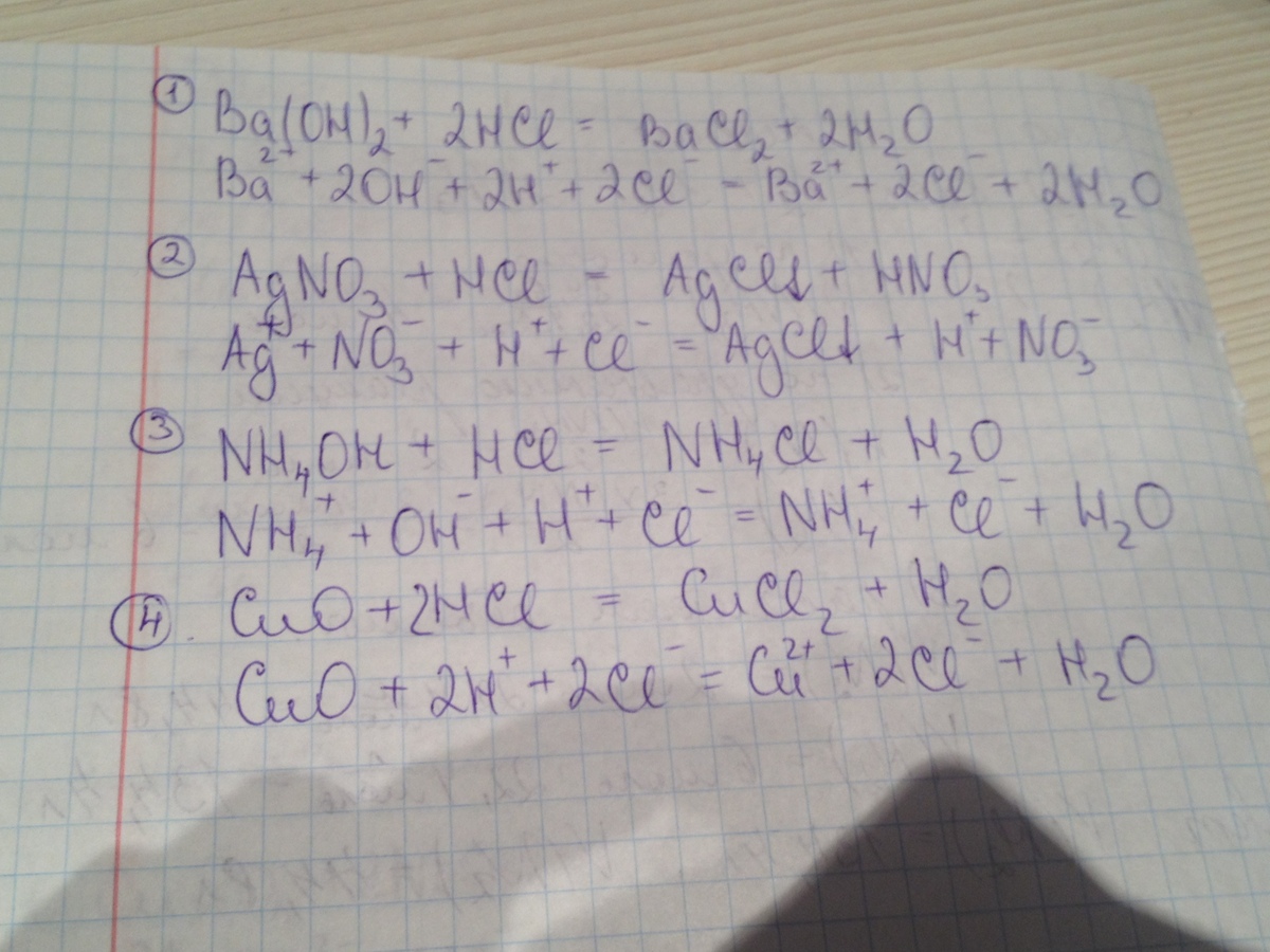 Какое из перечисленных явлений вступит в реакцию с раствором соляной кислоты:гидроксид бария,нитрат серебра,сульфат меди(II),нитрат натрия,сульфат калия,гидроксид аммония,оксид меди(II),оксид фосфора(V)?Составьте соответствующие уравнения реакций в молекулярной и полной ионной формах