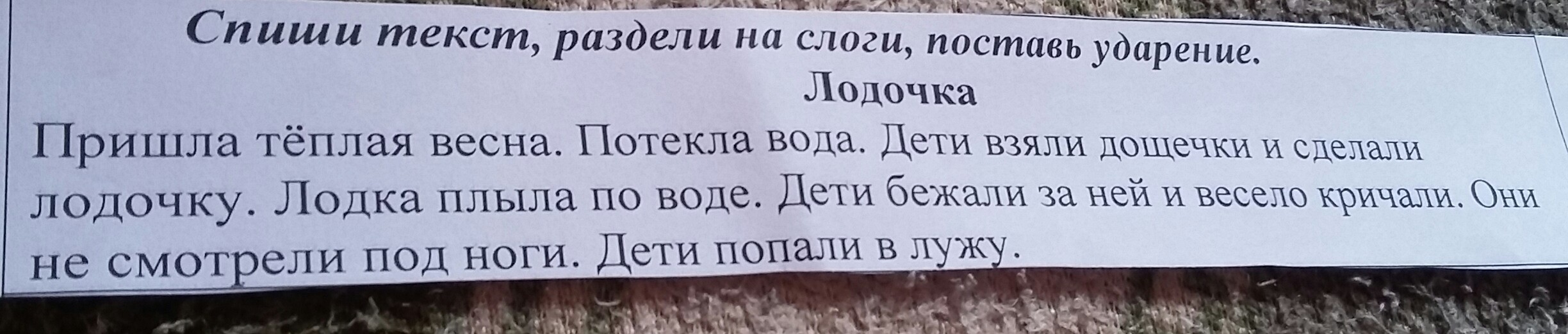 при-шла тёп-ла-я вес-на . по-те-ла во-да . де-ти взя-ли до-щеч-ки и сде-ла-ли ло-доч-ку . лод-ка пла-ла по во-де . де-ти бе-жа-ли за ней и ве-се-ло кри-ча-ли . о-ни не смот-ре-ли под но-ги. де-ти по-па-ли в лу-жу. -я напишу вместо слова букву на которе падает ударение- а ё а а а е я е е о(на первую) о а о е е а е е(на первую) а и е о е а у(на первую)