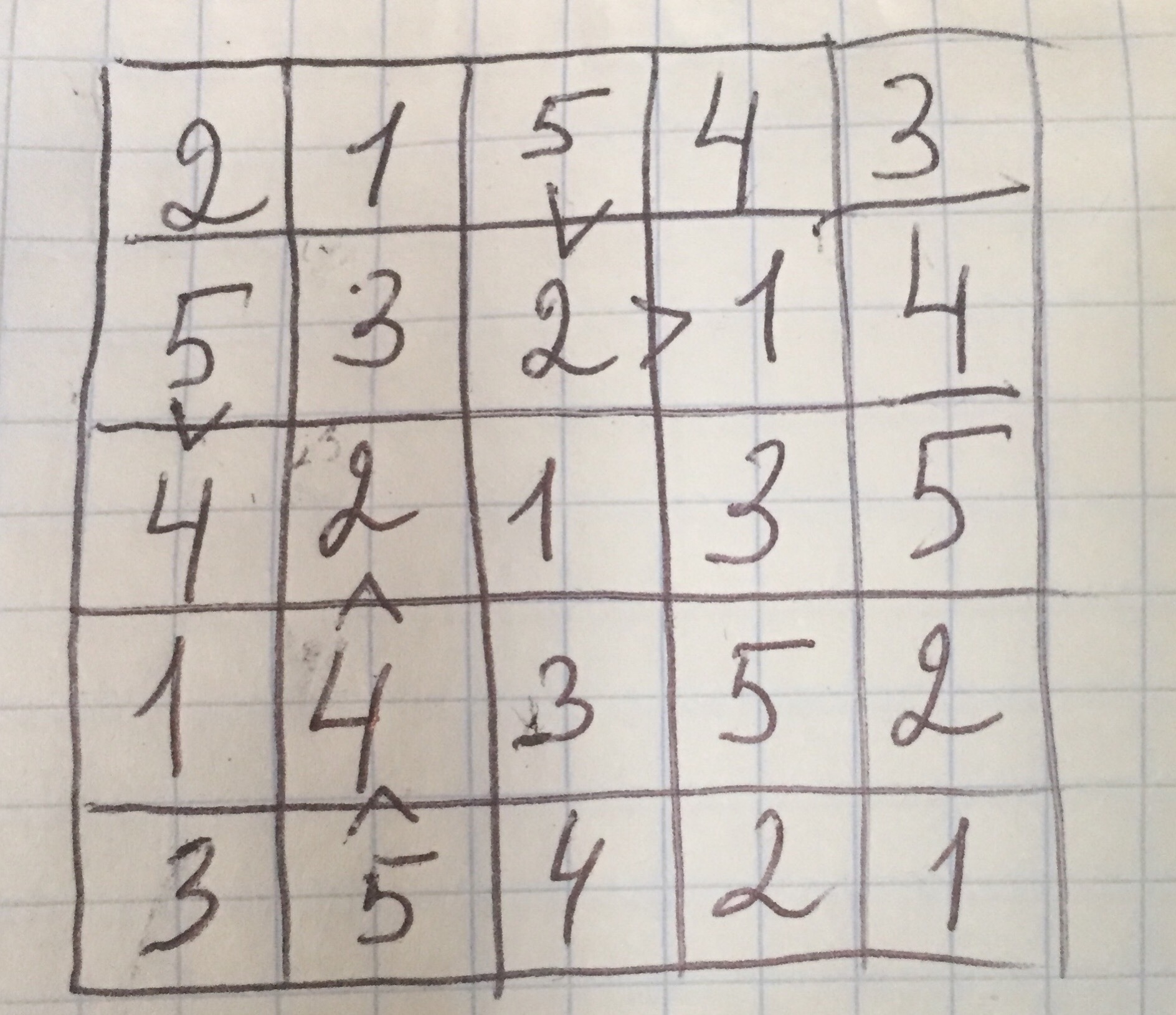 С помощью цифр 1,2,3,4,5 заполните таблицу так, чтобы в каждом столбце и каждой строке не попадались одни и те же цифры. Учитывайте знаки неравенства.
