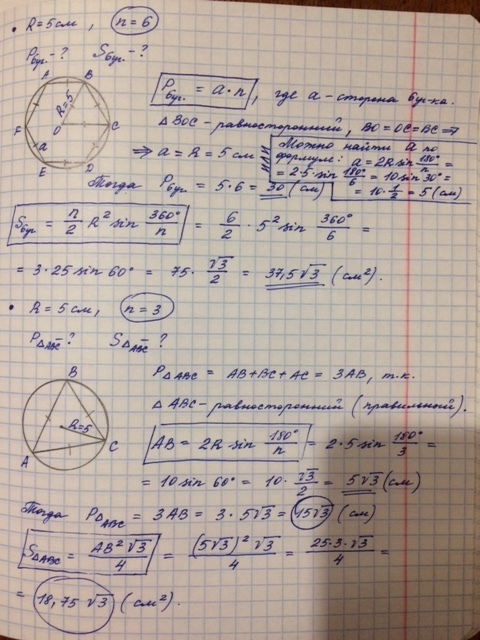 Постройте окружность радиуса 5 см. Впишите в нее правильный шестиугольник (треугольник). Найдите периметр и площадь шестиугольника (треугольника)