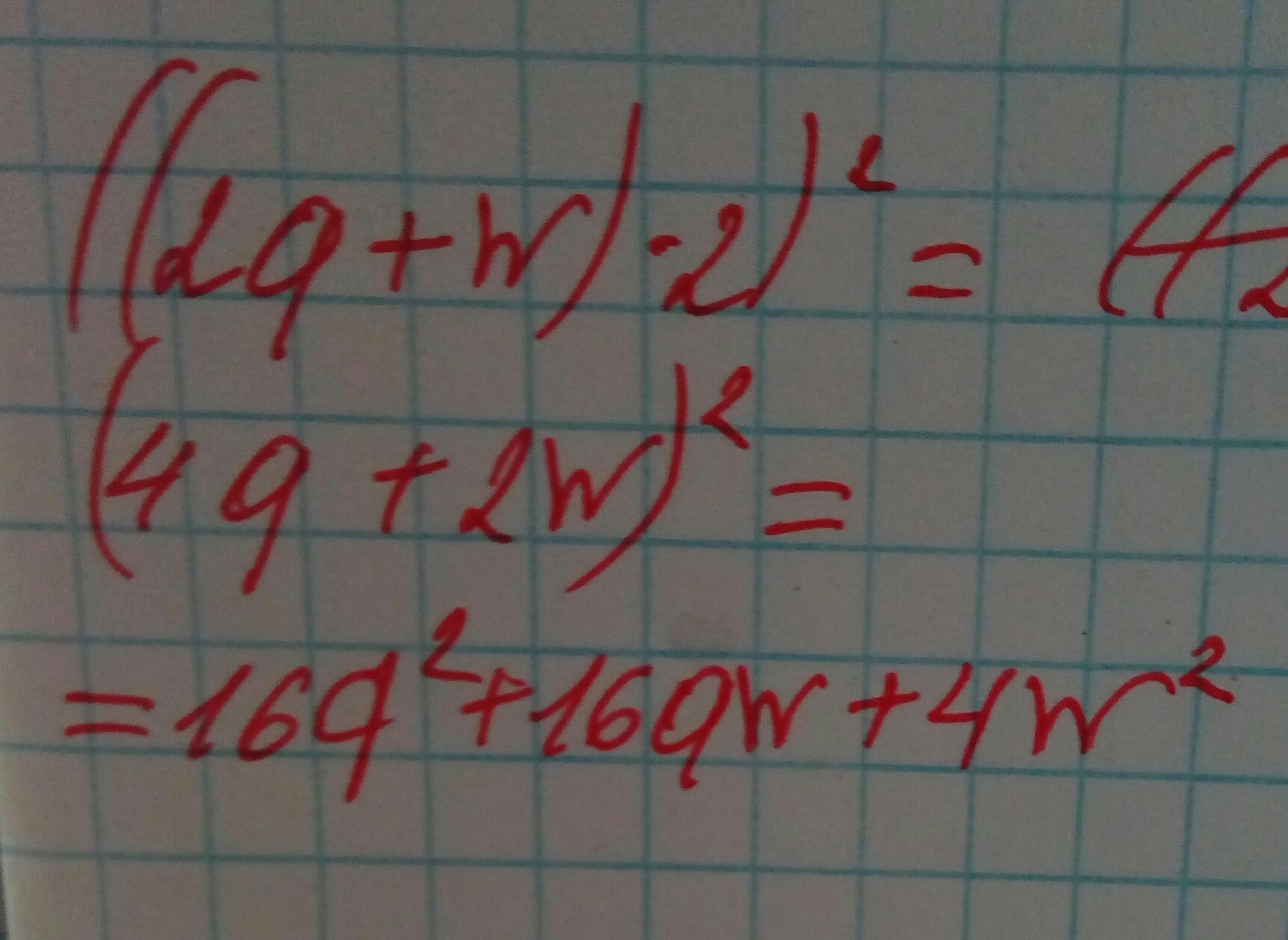 (4q+2w)^2=(4q+2w)(4q+2w)=16q^2+8qw+8qw+4w^2=16^2+16qw+4w^2