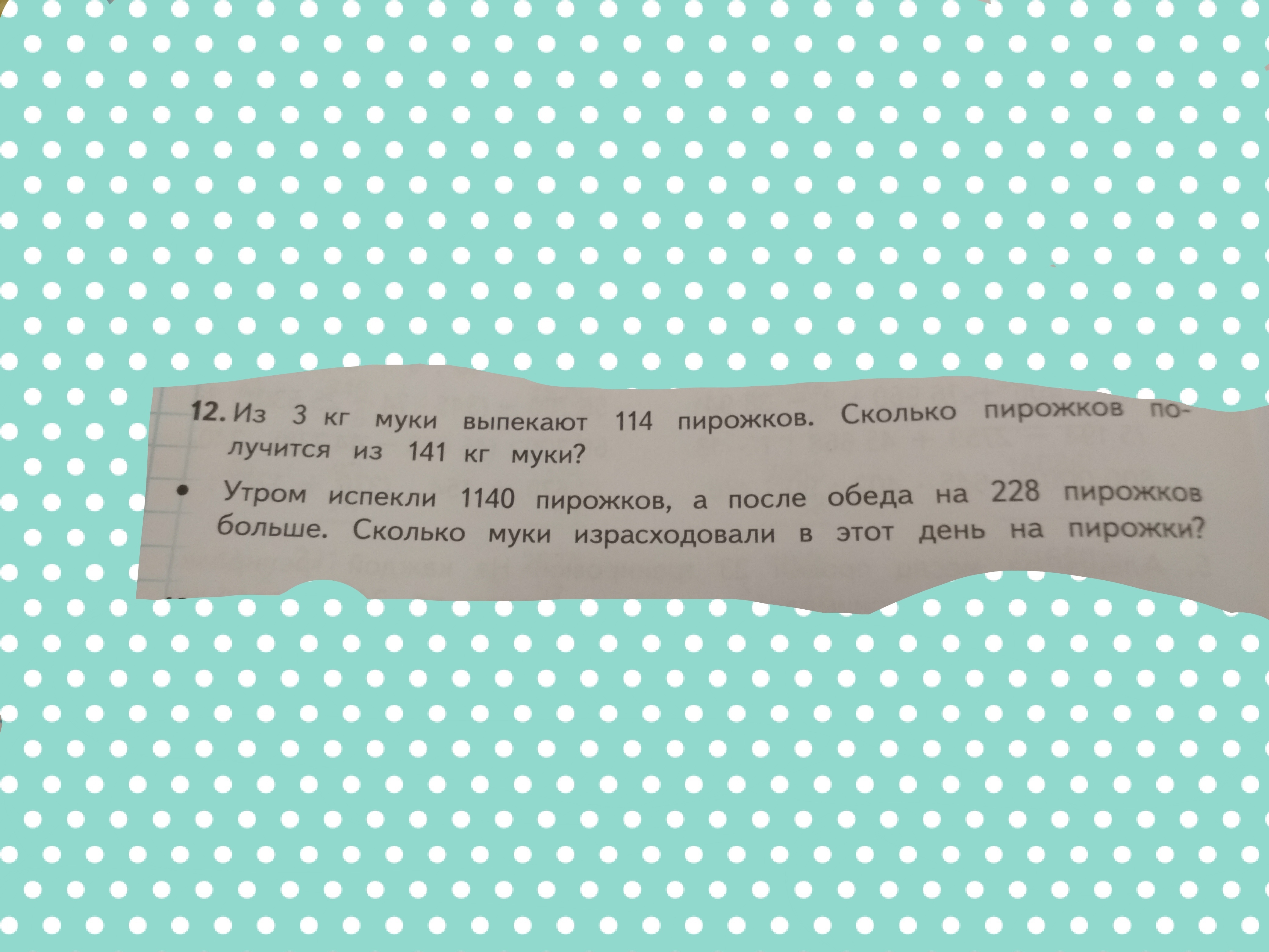 Утром испекли 1140 пирожков,а после обеда на 228 пирожков больше. Сколько муки израсходовали в этот день на пирожки?