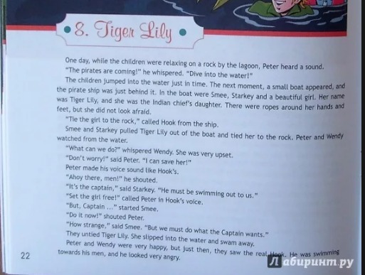 Дети запрыгнули в воду в тот же момент. Затем, приблизилась маленькая лодка пираты остановились как раз рядом с ними. В лодке были Сми, Старки и красивая девочка. Ее имя было Тайгр Лили(мое примечание:Тигровая Лилия, но обычно имена собственные не переводятся) и она была дочерью Индийского Вождя. Она была связана по рукам и ногам, но не выглядела испуганной.
