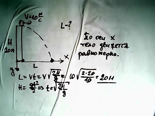 С крыши дома высотой 20 метров горизонтально бросил мяч с начальной скоростью 10м/с. Найти дальность полёта тела.