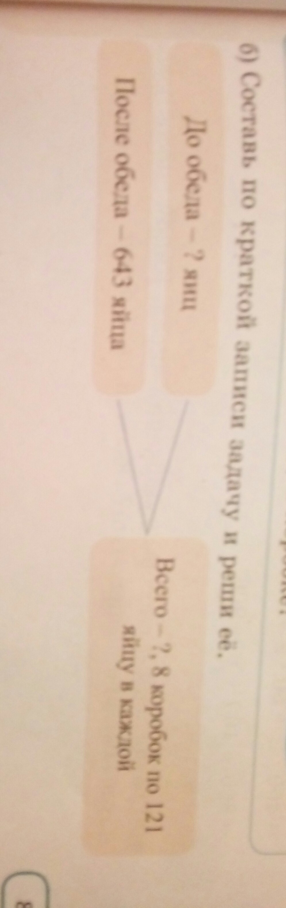 В в магазин привезли яйца. До обеда привезли несколько яиц. После обеда 643 яйца. всего привезли 8 каробок по 121 яйцо в каждой. Сколько яиц привезли до обеда?
