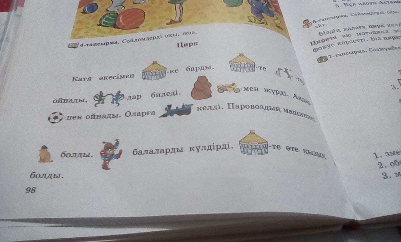 Катя әкесімен циркке барды. Циркте іттер ойнады. Маймылдар биледі. Аю мотоциклмен журді. Аидар доппен ойнады. Оларға паровоз келді. Паровоздың машинасында мысық болды. Сайқымазақ балаларды кулдірді. Циркте өте қызық болды.