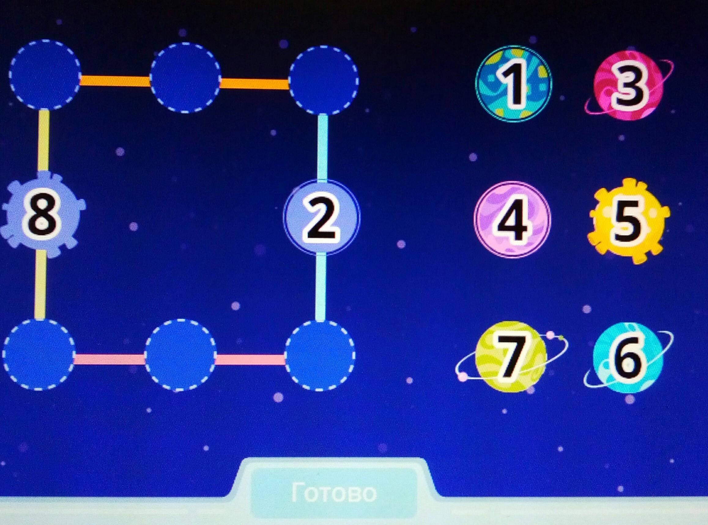 Расставь все планеты так, чтобы суммы чисел на каждой цветной линии были одинаковыми. СРОЧНО.