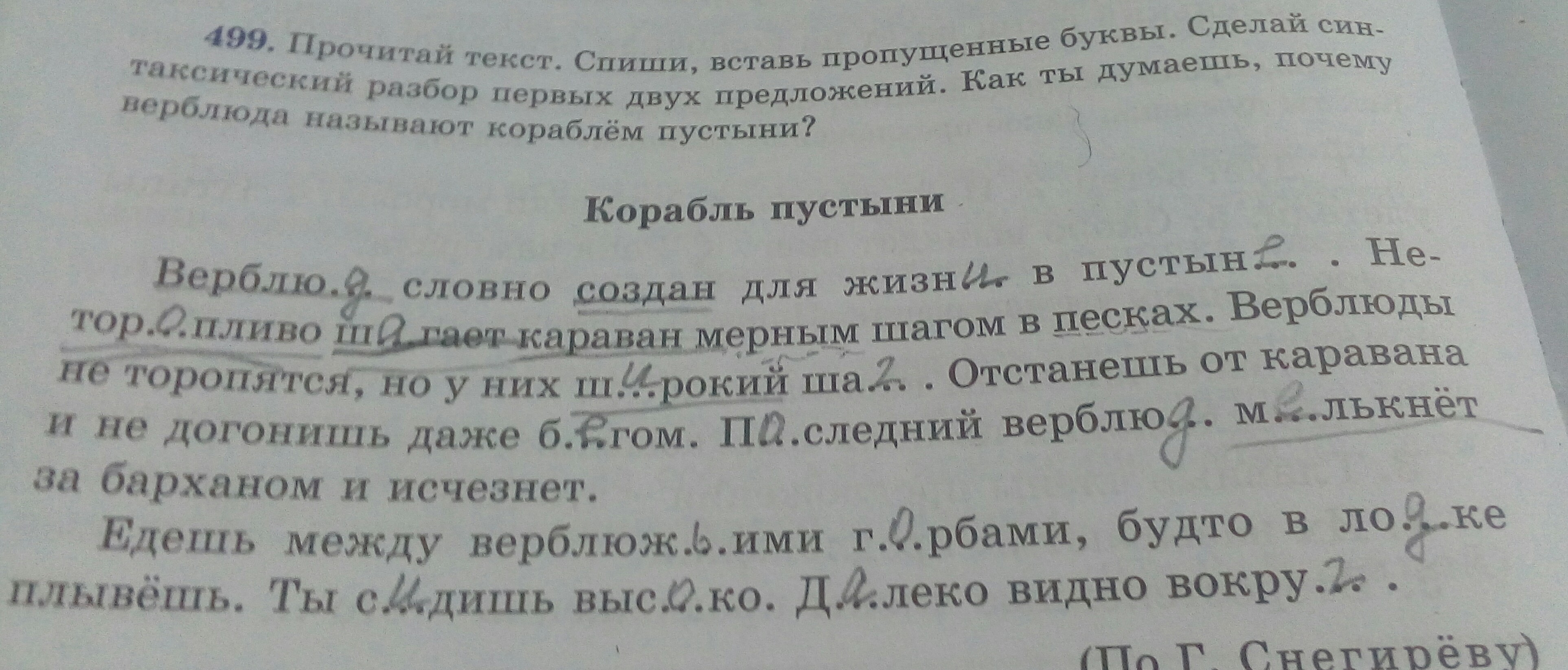 Верблюд (подлежащее) словно( обстоятельство) создан( сказуемое) для жизни ( дополнение) в пустыне(обстоятельство). Неторопливо ( обстоятельство) шагает( сказуемое) караван( подлежащее) мерным( определение) шагом (дополнение) в песках( обстоятельство).