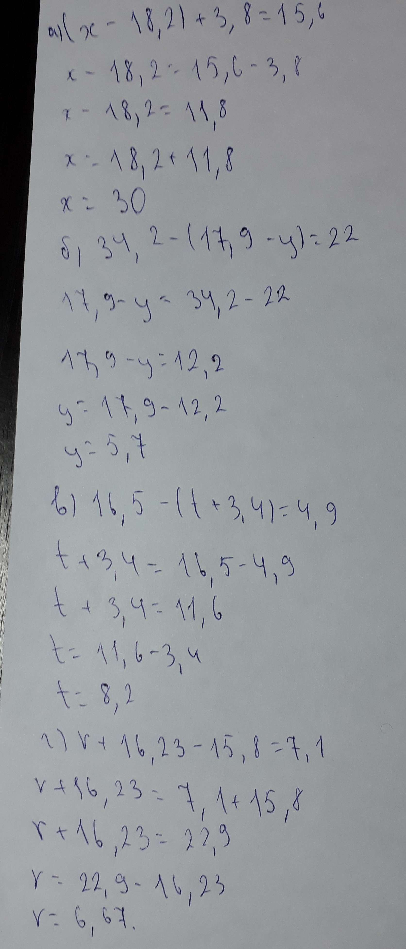 в) 16,5-(t+3,4)=4,9. г) r+16,23-15,8=7,1.