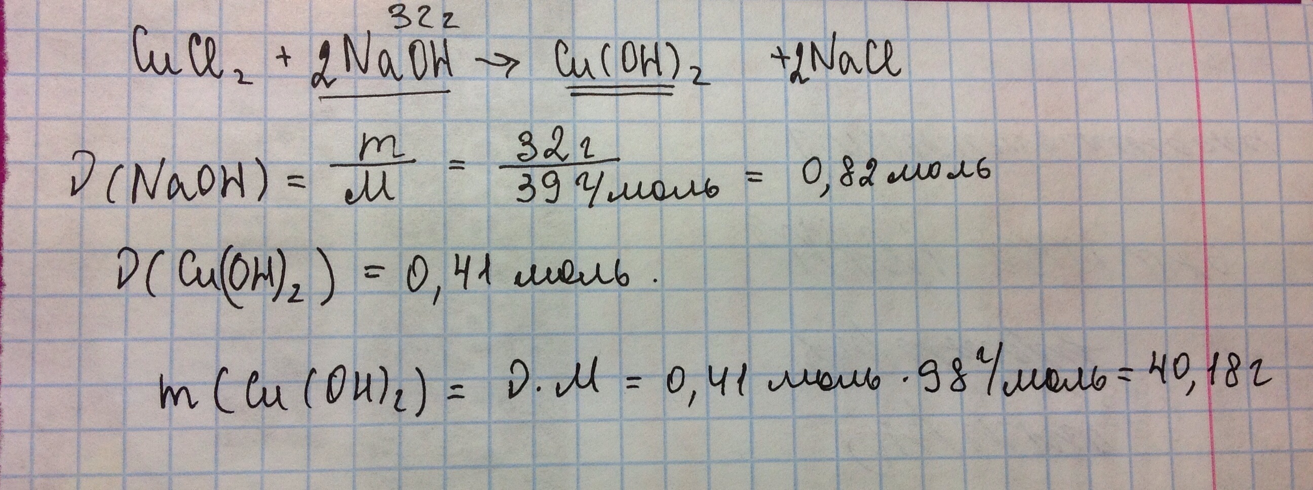 Вычислить массу гидроксида меди (II), полученного при реакции хлорида меди (II) с 32 гидроксида натрия.