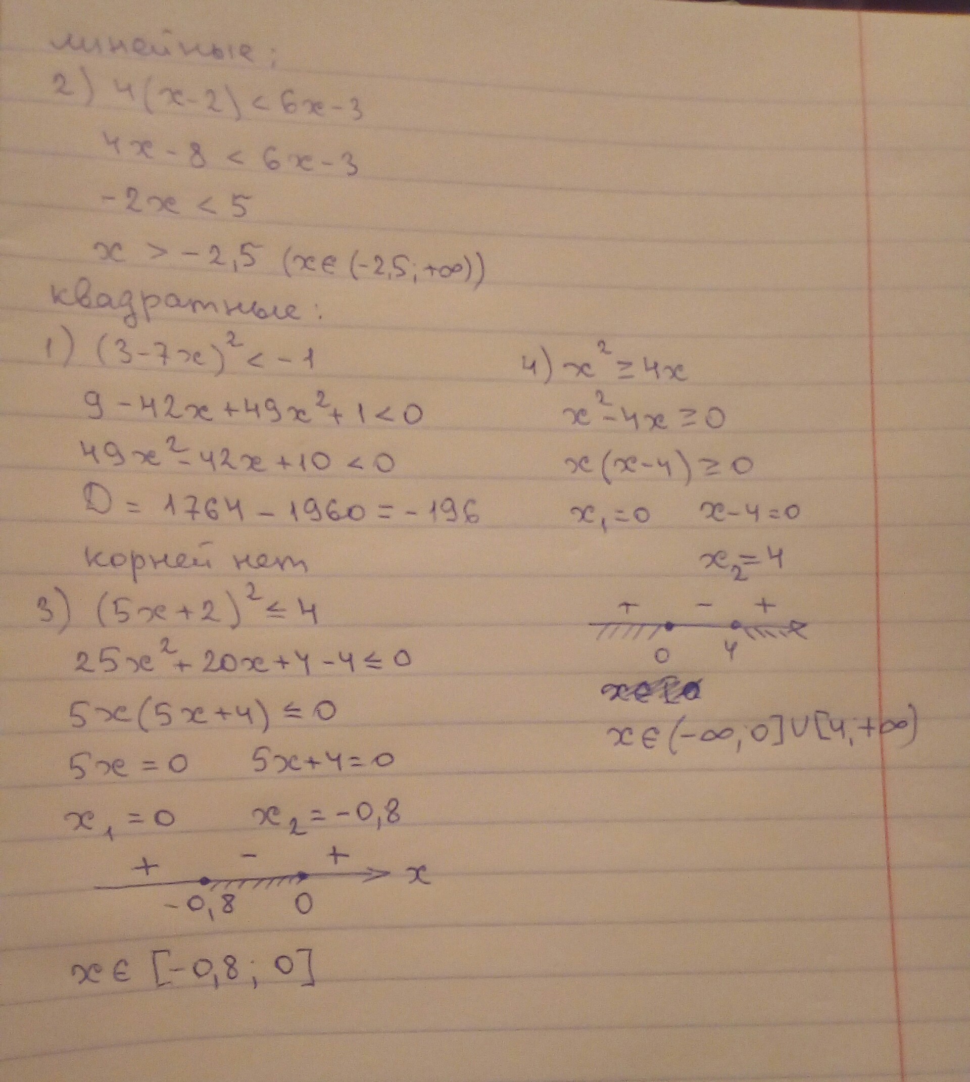 Решите неравенства разделив их на две группы линейные и квадратные неравенства. 1) (3-7x)в квадрате<-1. 2) 4(x-2)<6x-3. 3) (5x+2)в квадрате≤4. 4) x в квадрате ≥4x. Помогите пож решите что можете