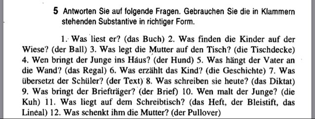 1. Что он читает? (Книгу) 2. Что дети нашли на лугу? (Мяч) . Что мама кладет/стелет на стол? (Скатерть) 4. Кого мальчик принес в дом? (Собаку) 5. Что вешает отец на стену? (Полку) 6. Что рассказывает ребенок? (Историю) 7. Что переводит ученик/школьник? (Текст) 8. Что вы пишете сегодня? (Диктант) 9. Что принес почтальон? (Письмо) 10. Кого рисует мальчик? (Корову) 11. Что лежит на письменном столе? (Тетрадь, карандаш, линейка) 12. Что мама подарила ему? (Пулловер/Пальто/Куртку)