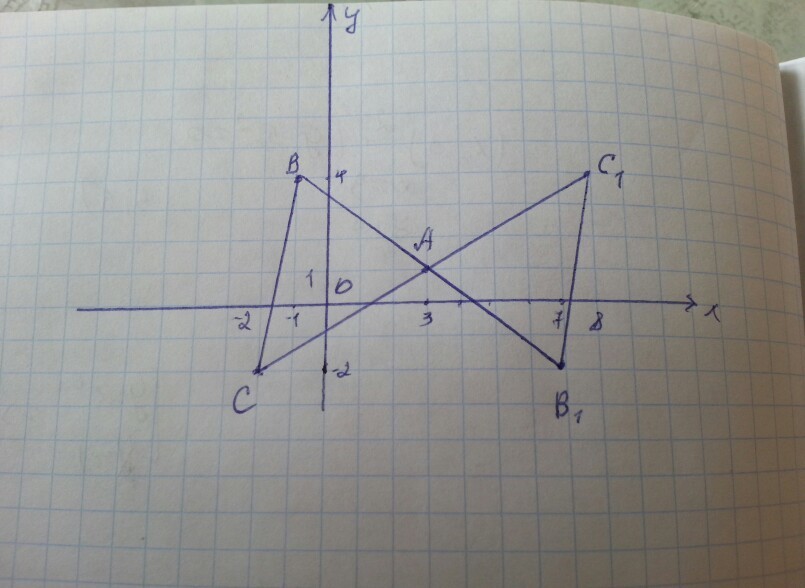 Постройте треугольник,симметричный треугольнику АВС относительно точки А, если А(3;1),В(-1;4),С(-2;-2).