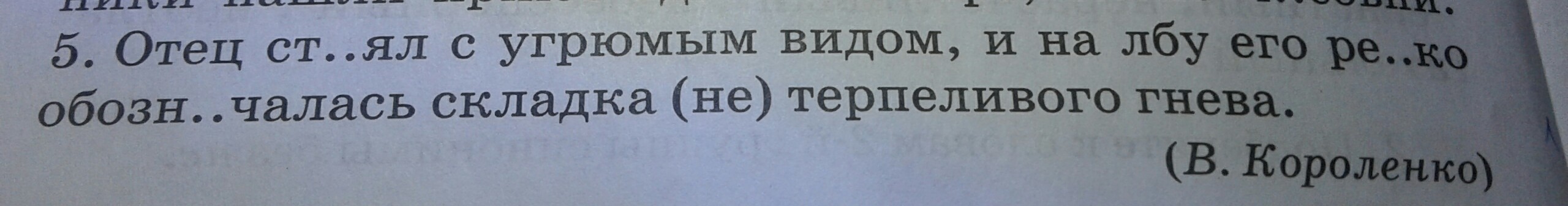 Отец(__ сущ.) стоял(= глаг.) с ( ∆ ) угрюмым (~~~~~ прил.) видом(- - - - - - сущ.), и(о) на(∆) лбу( -•-•-• или - - - - - сущ.) его( ~~~~~мест)