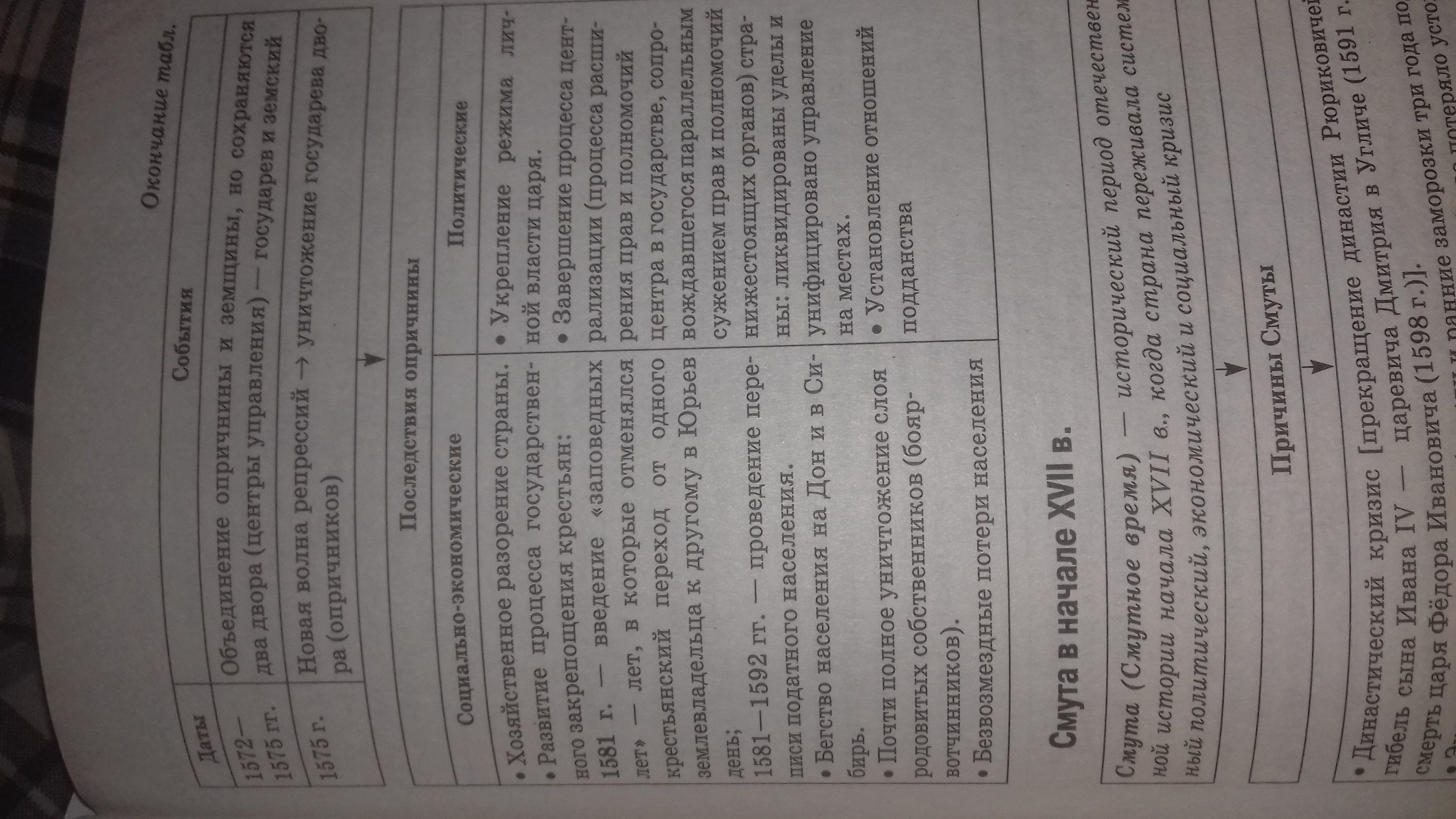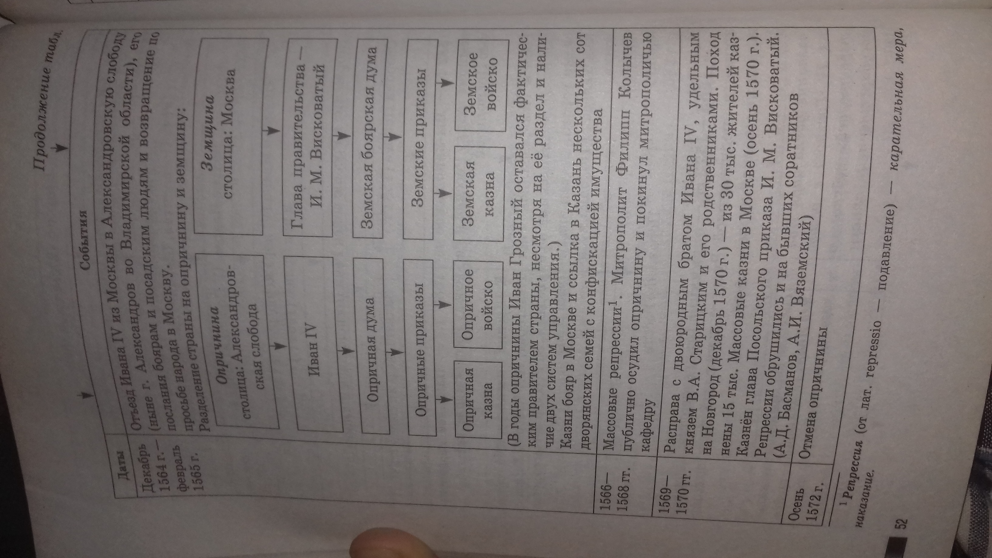 Опричнина: земли (поморские районы, земли на Урале, ряд слобод и улиц Москвы, центральные районы с боярскими вотчинами, столица - Александрова слобода), управление (опричная дума и опричные приказы).