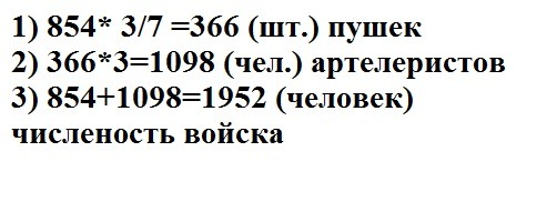 Когда барон Мюнхгаузен пролетал на ядре над турецким войском,он насчилат 854 сабли. Количество пушек у турок составляло 3/7 от количества сабель.Какова численность турецкого войска,если каждую пушку обслуживало 3 артиллериста без сабель,а все остальные войска имели по одной сабле?