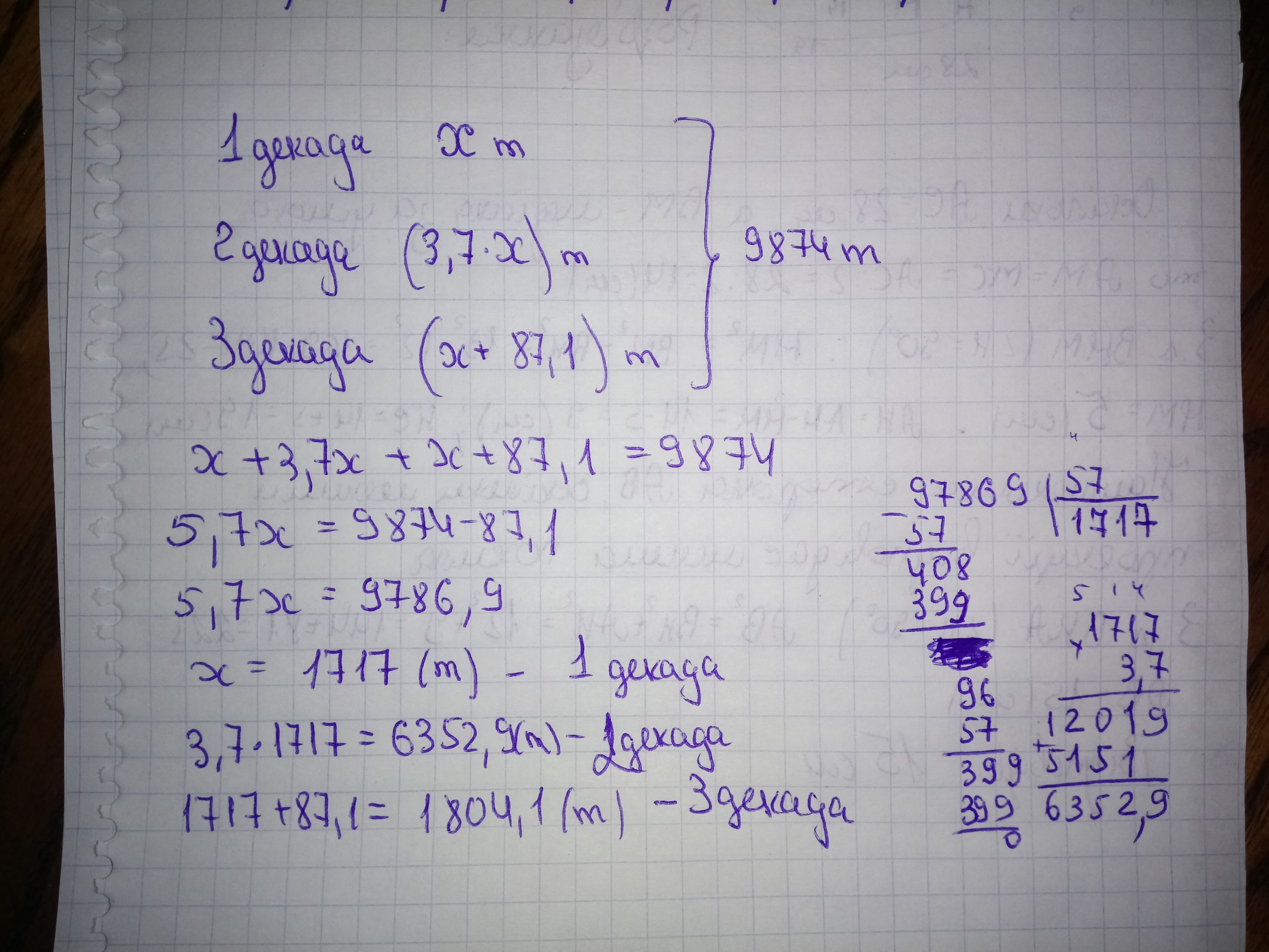 На шахті за місяць добули 9874т. За першу декаду добули в 3,7 разу меньше, ніж за другу, а за третю на 87,1 більше ніж за першу. Скільки тонн вугілля добули за кожну декаду окремо?