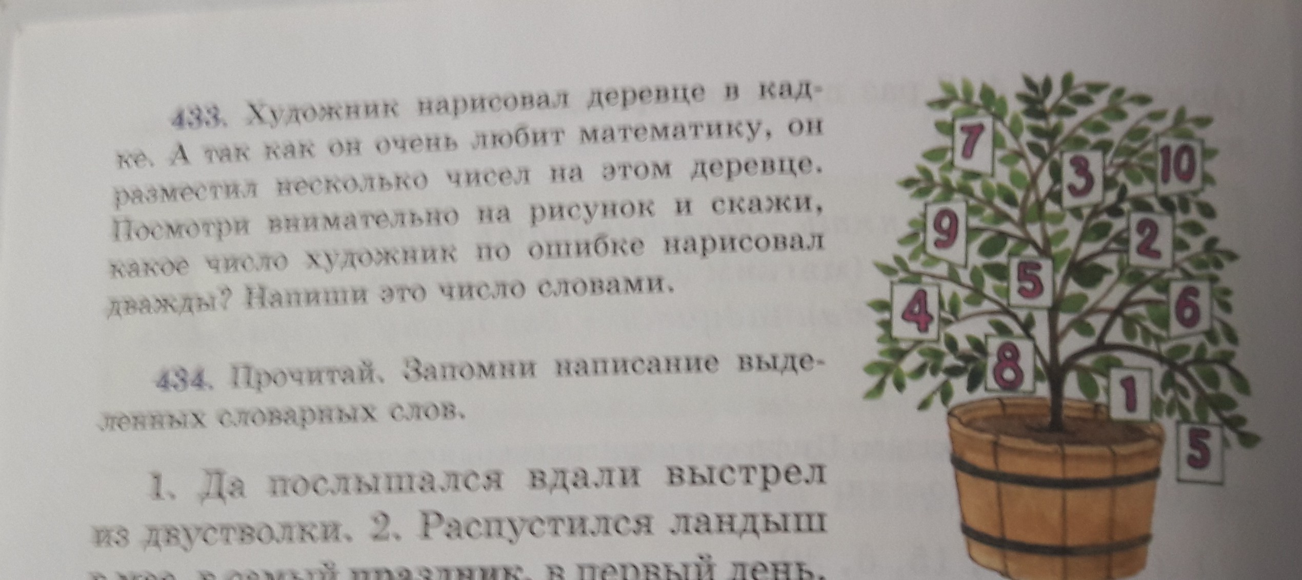 Художник нарисовал деревце в кадке а так как он очень любит математикуон разместил несколько чисел на этом деревце посмотри внимательно на рисунок и скажи какое число художник по ошибке нарисовал дважды? Напиши это число словами.