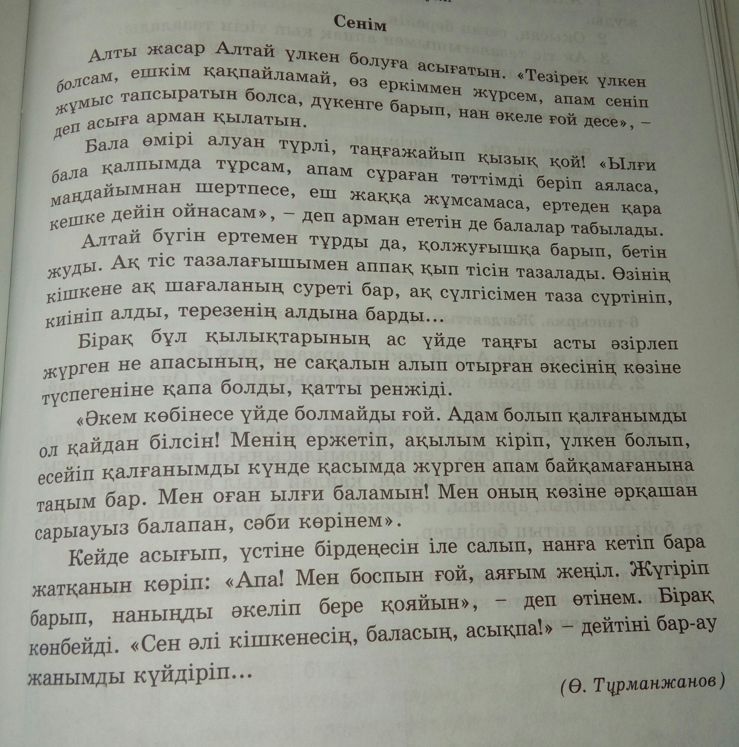 Сегодня Алтай проснулся рано,он встал ,прошел к умывальнику и умыл лицо. Почистил свои белые зубы белой зубной щеткой. Вытерся своим маленьким полотенцем, в углу которого была вышита маленькая чайка. Оделся и подошел к окну. И обиделся ,что все его проделанные действия не нашли отклик ни у мамы,которая готовила завтрак, ни у отца, который брился. " Отца ведь дома толком не бывает,откуда он знает ,что я вырос. Но почему то, что я стал умнее и взрослее не замечает мама, которая всегда рядом со мной? Я для нее всего лишь ребенок, кажусь ей желторотым птенчиком. Иногда,когда она накинув какую-то верхнюю одежду, торопится в магазин за хлебом,на мой возглас " мам,я же свободен, давай я быстро сбегаю", отвечает очень зля меня : " Ты еще маленький,не торопись , набегаешься еще" " ,- обиженно подумал мальчик.