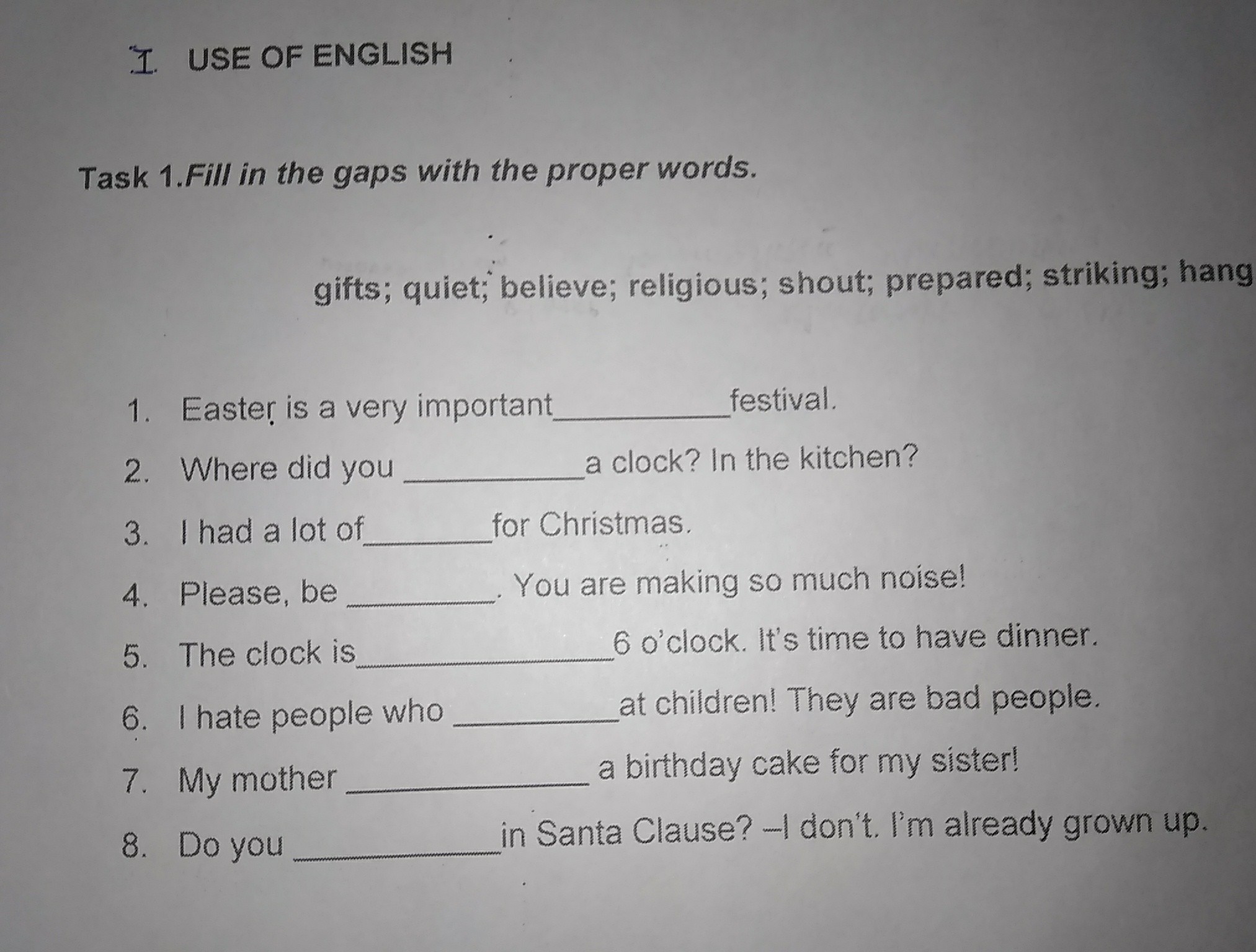 1 - religious. 2 - hang. 3 - gifts. 4 - quiet. 5 - striking.6 - shout. 7 - prepared. 8 -believe.