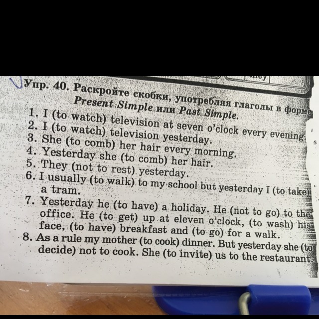 1 - Watch. 2 - Watched.3 - Combs. 4 - Combed. 5 - Didnot rest . 6 - Walk Took. 7 - Had Doesnot Go gets Washes has goes.