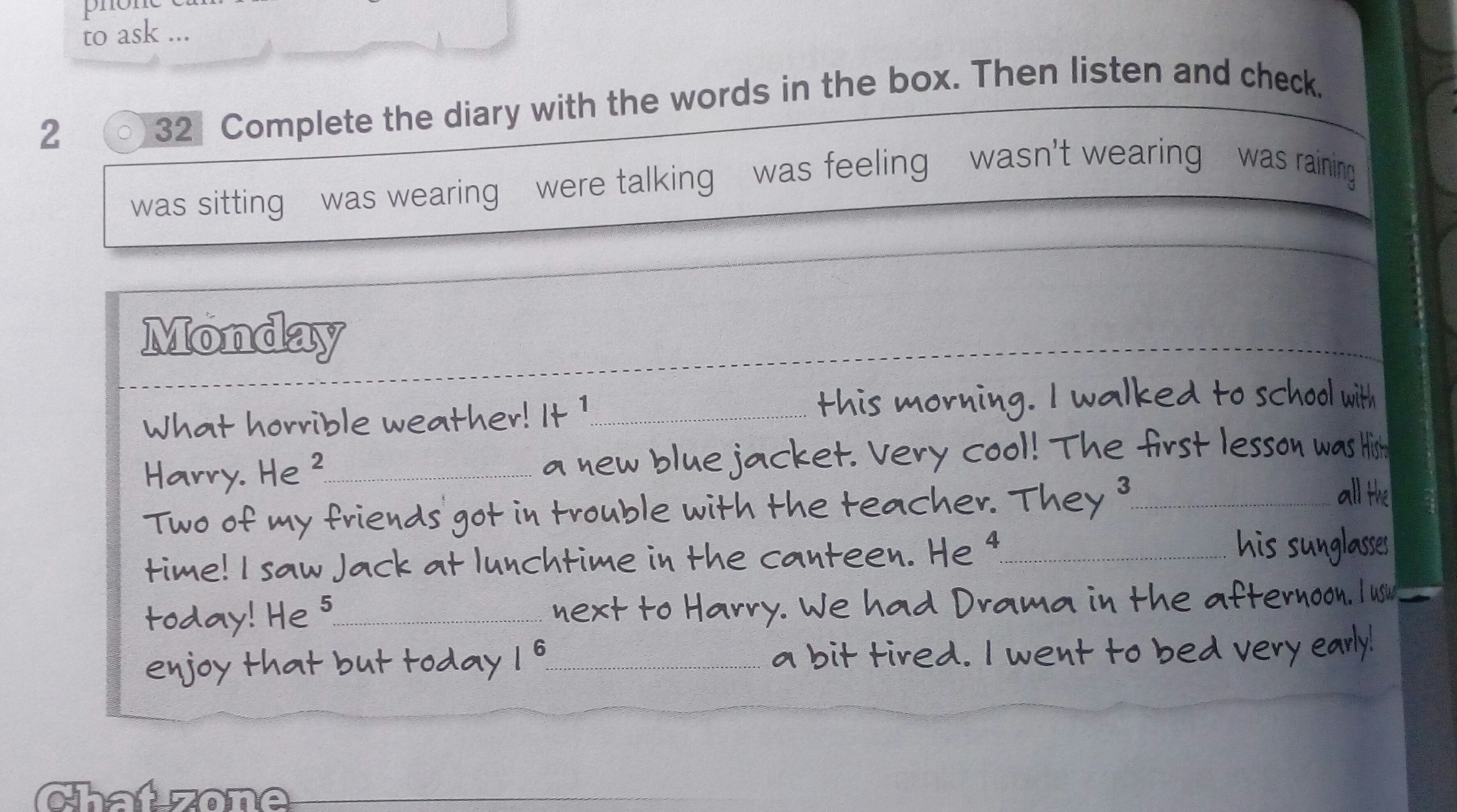 It was raining. He was wearing a new blue jacket. They were talking all the time. He wasn't wearing his sunglasses today. He was sitting next to Harry. I was feeling a bit tired.