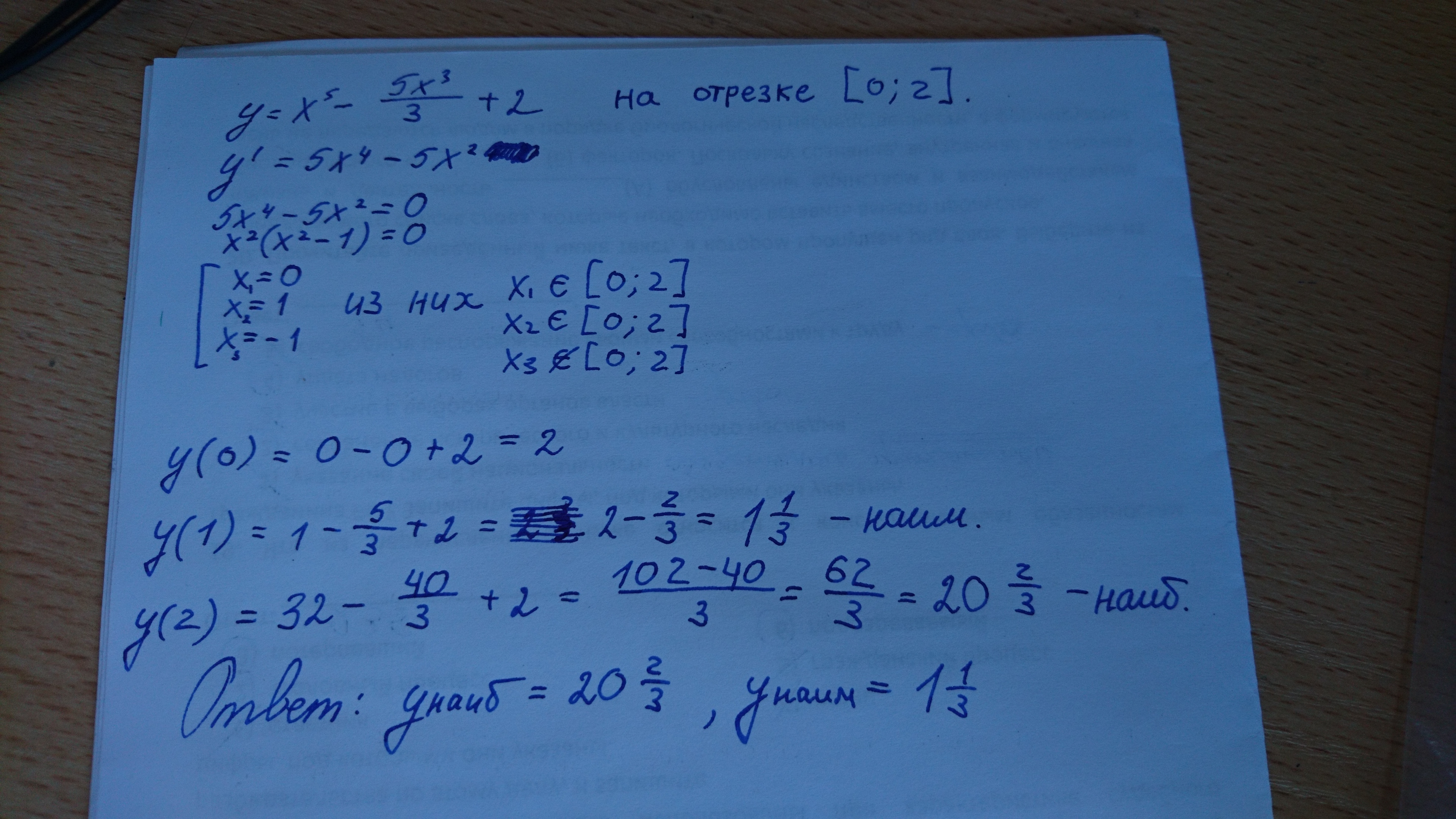3) Подставляем в исходную функцию концы отрезка (точки 0 и 2), а также точки экстремума, найденные в пункте 2.