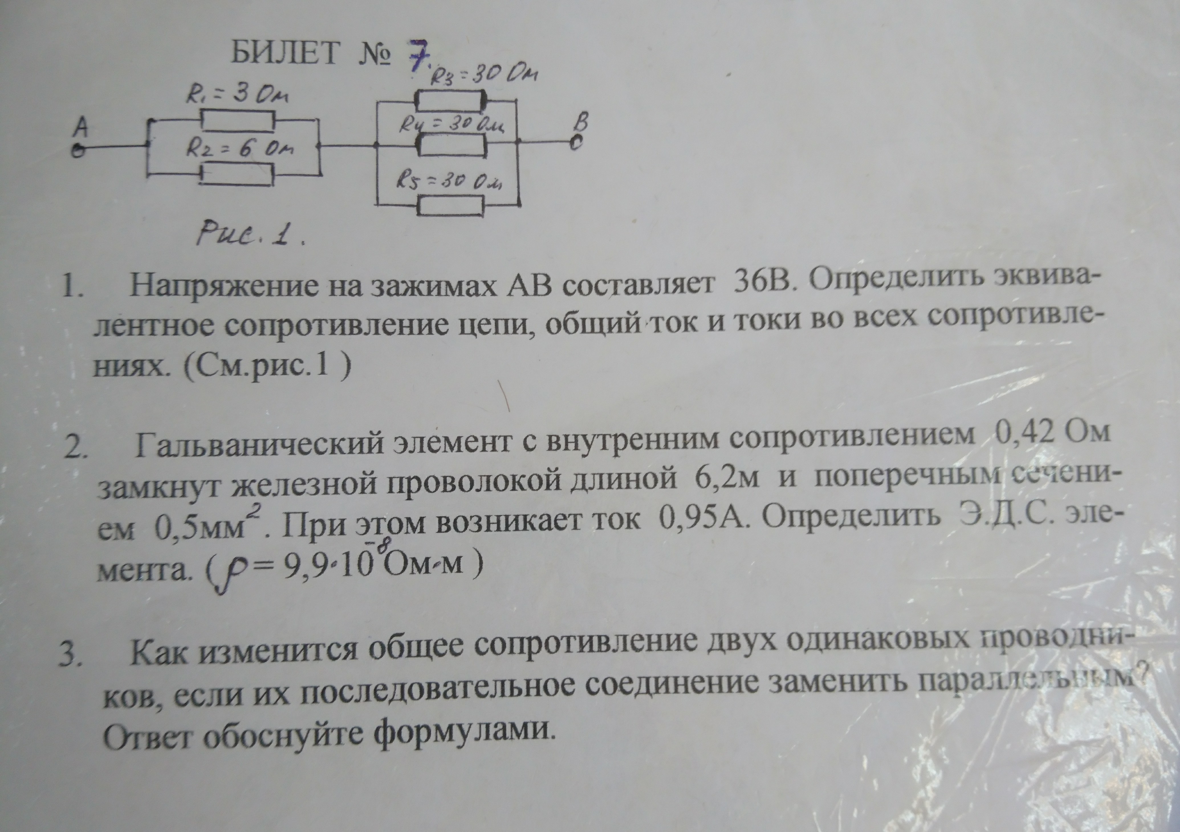 R₁ R₂ параллельны 1/R₁₂=1/R₁+1/R₂ R₁₂=2 Ом. R₃, R₄,R₅-параллельны и равны(30 Ом) R₃₄₅=10 Ом в 3 раза меньше каждого из них R₀=R₁₂+R₃₄₅