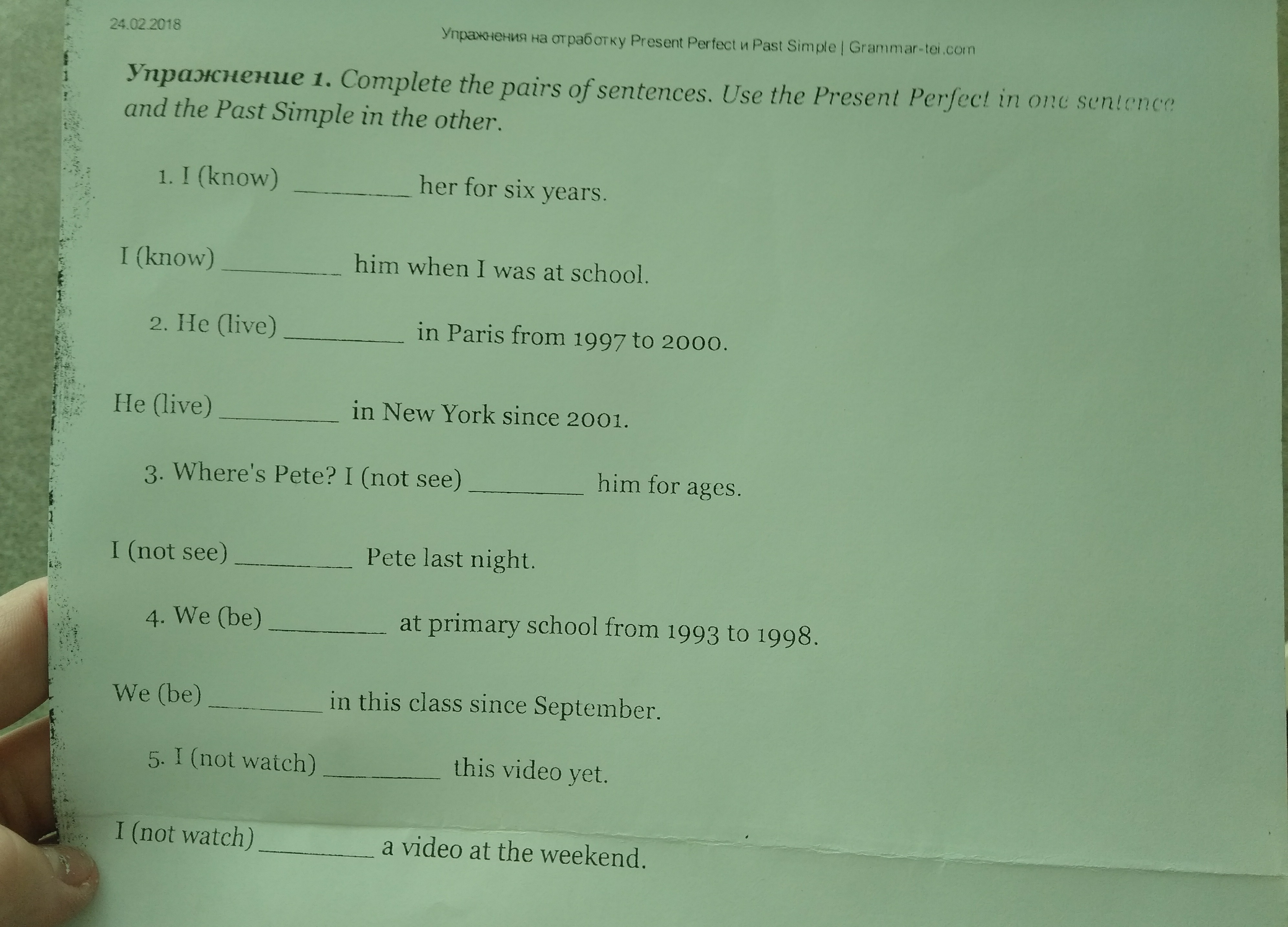 1. I have known her for six years. .I knew him when I was at school. 2.He lived in Paris from 1997 to 2000. He has lived in NY since 2000. 3. Where's Pete? I haven't seen him for ages. I didn't see Pete last night. 4.We were at primary school from 1993 to 1998. We have been in this class since September. 5. I haven't watched this video yet. I didn't watch a video at the weekend.