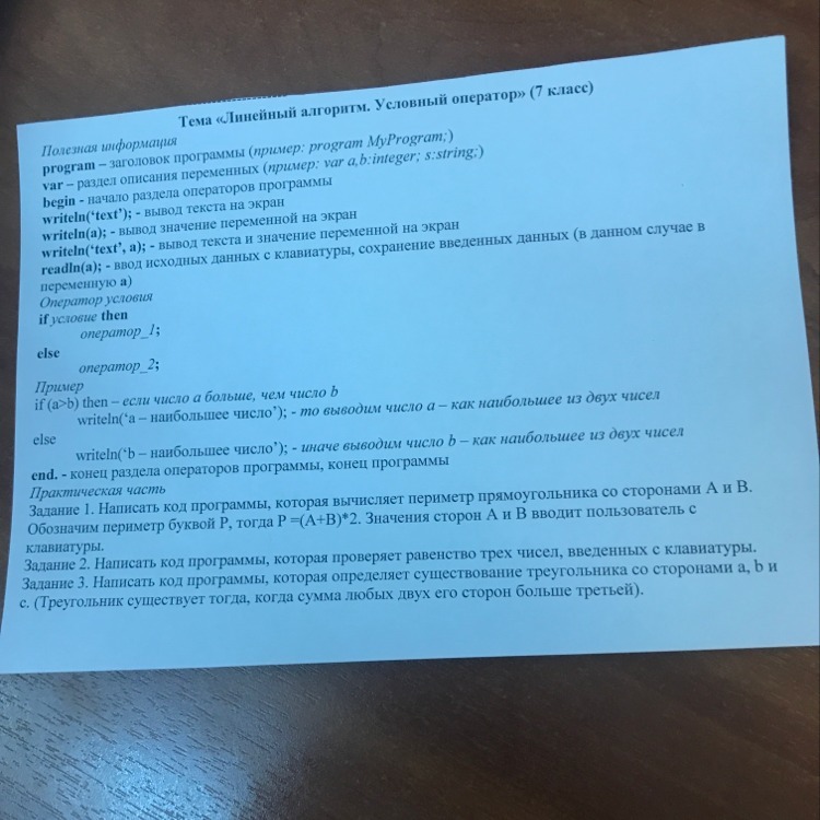 program msnvvv; var a,b,c,e,d,f: integer; begin writeln('введите стороны треугольника'); readln(a); readln(b); readln(c); e:=a+b; d:=a+c; f:=b+c; if (d>b) and (e>c) and (f>a) then writeln('треугольник существует'); if (d<=b) or (e<=c) or (f<=a) then writeln('треугольник не существует'); end.