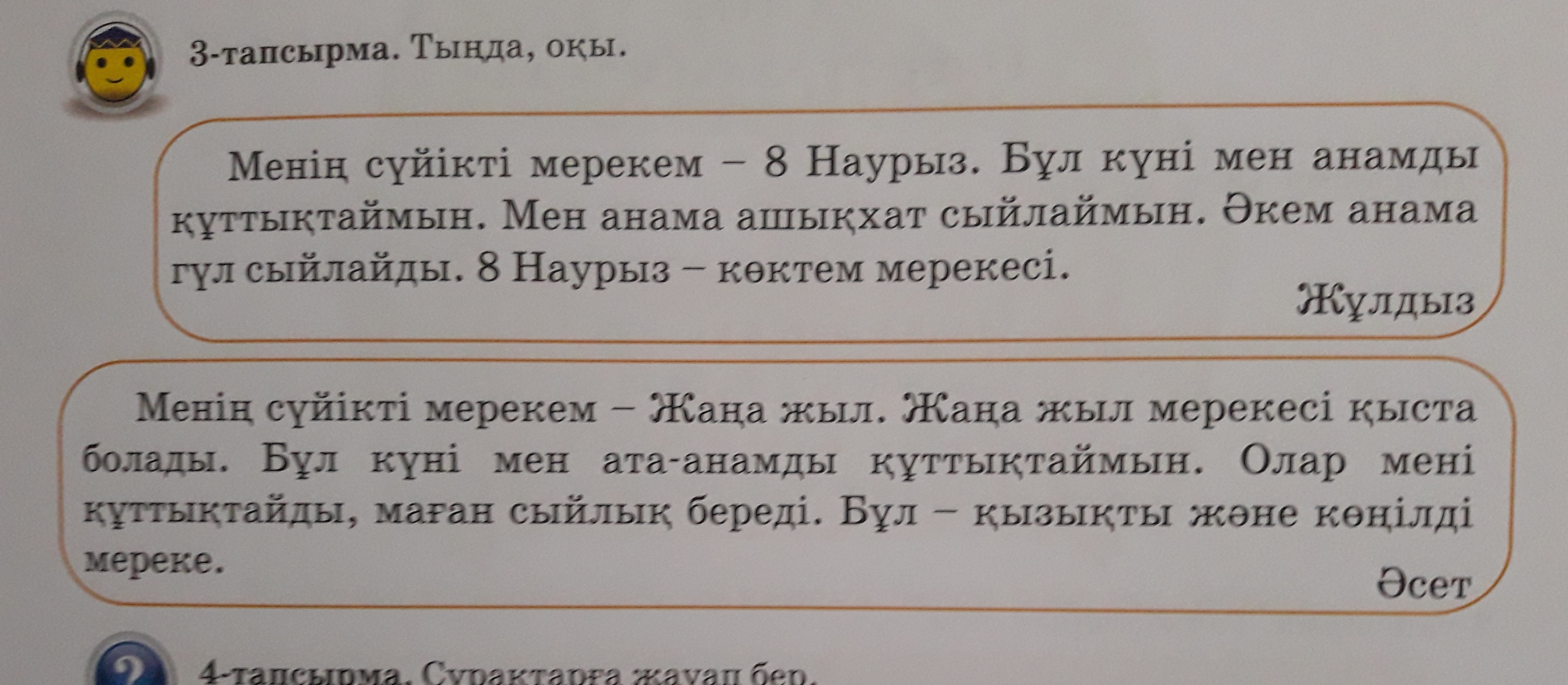 Ж: Менің сүйікті мерекем - 8 наурыз, бұл көктем мерекесі. Ал сенің?