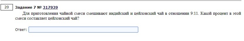(#20) Для приготовления чайной смеси смешивают индийский и цейлонский чай в отношении 9:11. Какой процент в этой смеси составляет цейлонский чай?