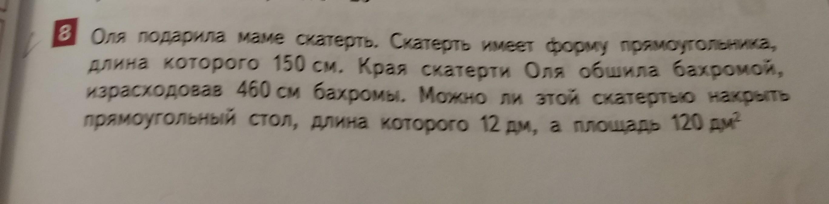 Оля подарила маме скатерть скатерть имеет форму прямоугольника длина которого 150 см края скатерти Оля обшила бахромой израсходовав 460 см бахромы Можно ли этой скатертью накрыть прямоугольный стол длина которой 12 дм а площадь 120 дм квадратных