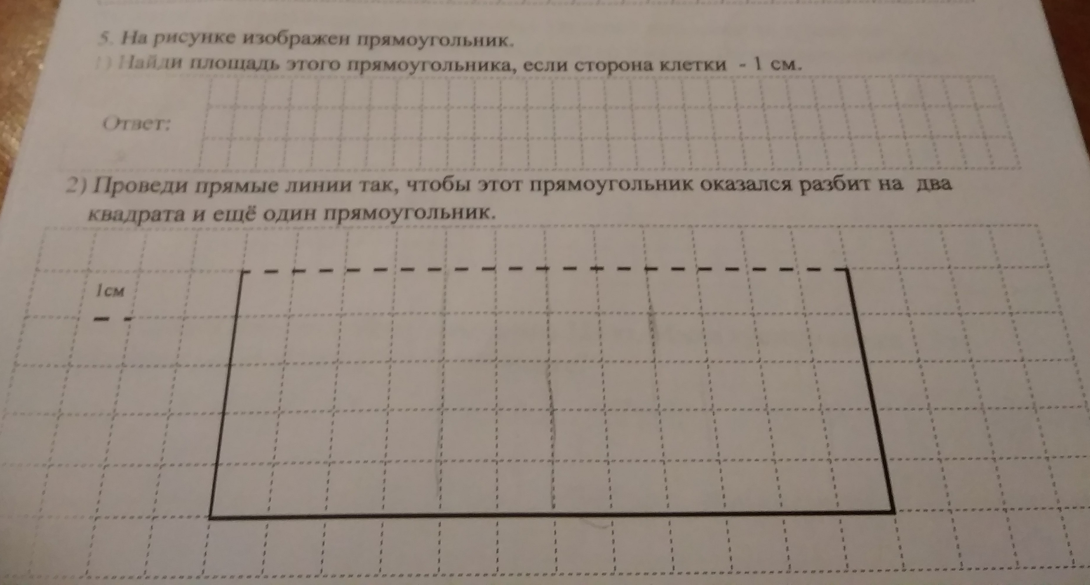 1) Найдите площадь этого прямоугольника, если сторона клетки - 1 см. 2) Проведи прямые линии так, чтобы этот прямоугольник оказался разбит на два квадрата и ещё один прямоугольник.