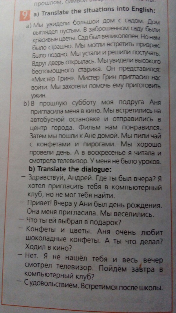 a) We saw it looked empty. In the abandoned garden there were beautiful flowers.Sadby to the great Lepelin people was scared. We could meet the praha. It was late. We were tired and decided to knock. Door suddenly opened. We saw a tall helpless old man. He introduced himself. Mr. Green. " Mr. Green is about to enter us. We wanted to help him prepare b) last Saturday my friend Anya invited me to the cinema. We are at a bus stop and went to the city center. We liked the film. Then we went to Anna home. We drank tea with sweets and pies. We had a good day. And on Sunday I read and watched TV. I did not have lessons b) Translate the following: Hello, Andrew. Where were you yesterday? I wanted to invite you to a computer club, but could not find you. Hello! Yesterday Ani had a birthday. She invited me. We had fun What did you choose as a gift for her? Candy and flowers. Anya loves chocolate candies very much. And what did you do? Went to the cinema? No. I did not find You and watched TV all evening. Shall we go to the computer club tomorrow? We meet after school.