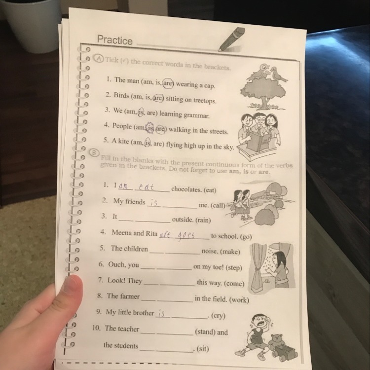 Вспомогательные глаголы are,is,am пишутся в Презент Континиус.К глаголы прибавляют окончание ing.