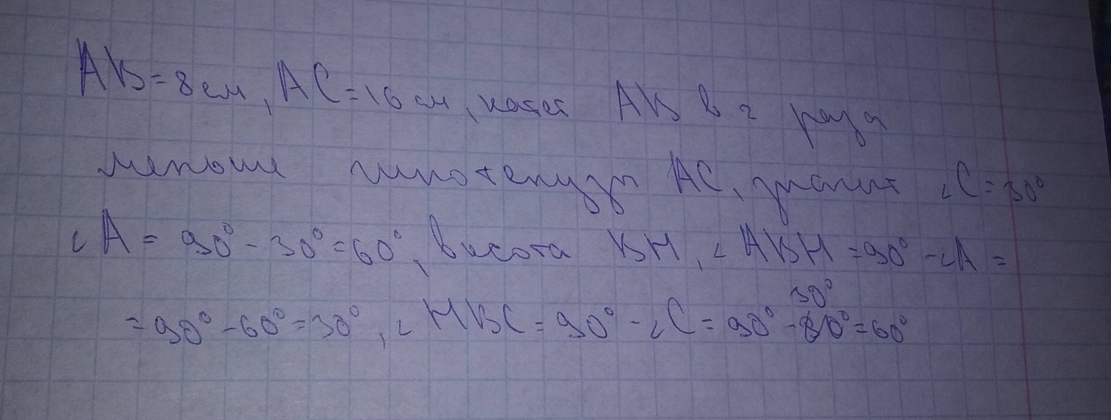 В прямоугольном треугольнике ABC угол B=90градусов, AB=8см, AC=16см. Найдите углы, которые образует высота BH с катетами треугольника.