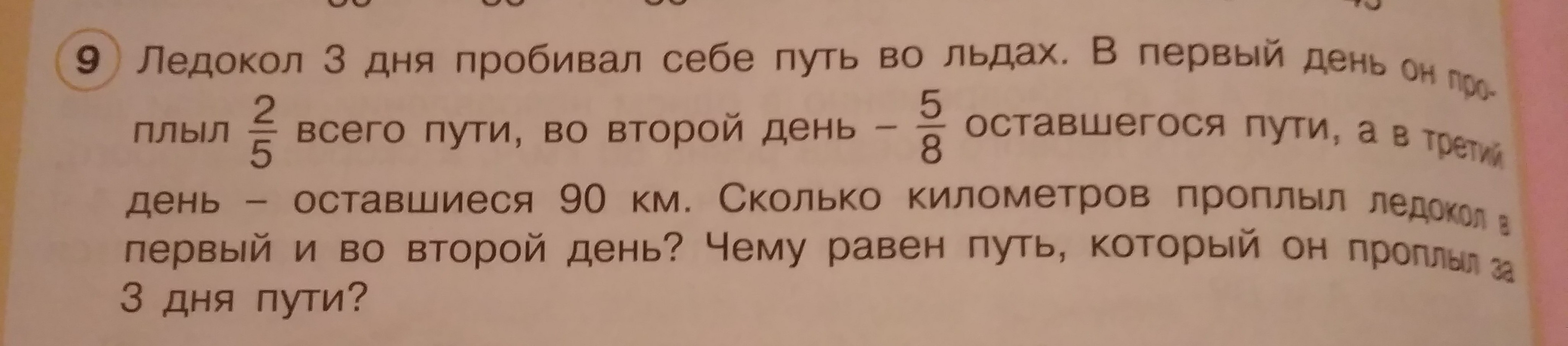 Предположим, что х – это весь путь пройденный ледоколом, тогда в первый день он проплыл 0,4x, следовательно, во второй день 0,625(x-0,4x) или 0,375х, а в третий день - оставшиеся 90 км