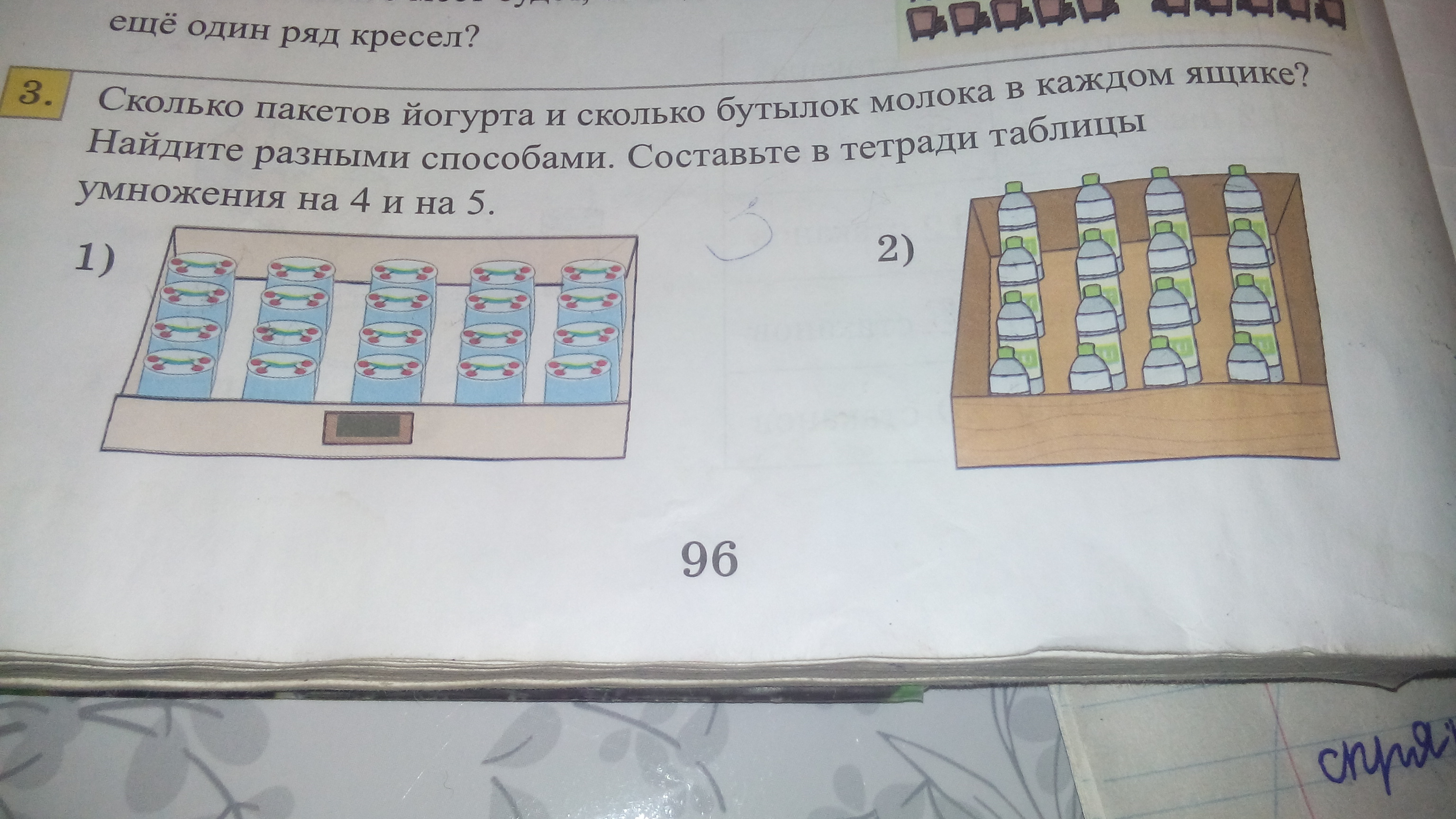 сколько пакетов йогурта и сколько бутылок молока в каждом ящике найдете разным способами составте в тетрадь таблицы умножения 4и на 5
