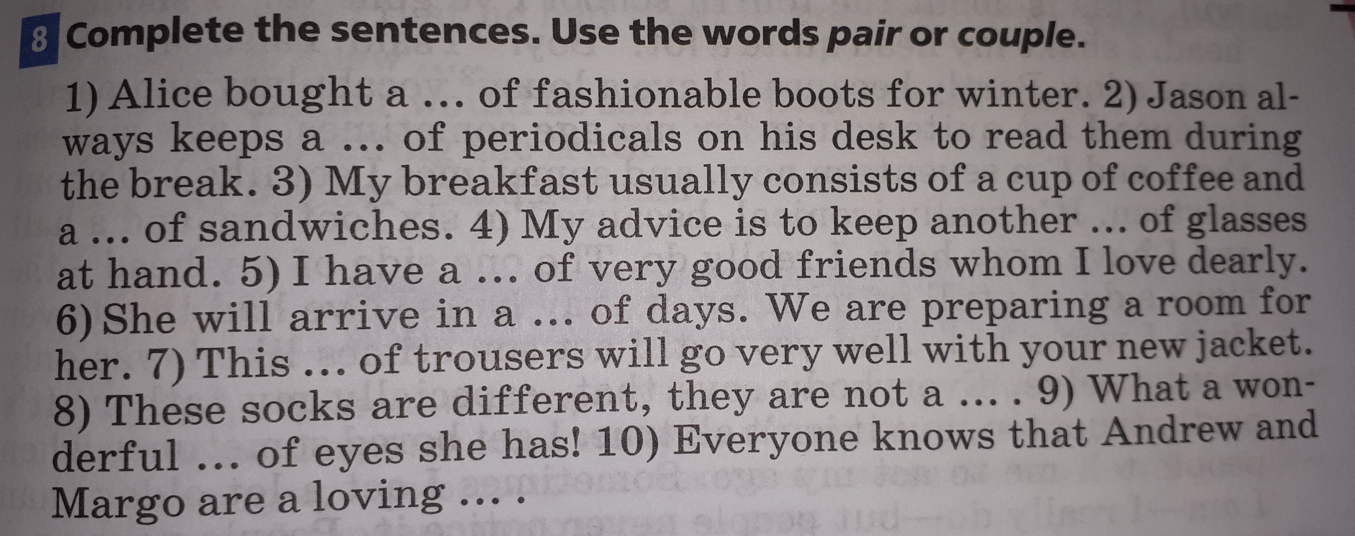 1)pair;2)couple;3)couple;4)pair;5)couple;6)couple;7)pair;8)pair;9)pair;10)pair.