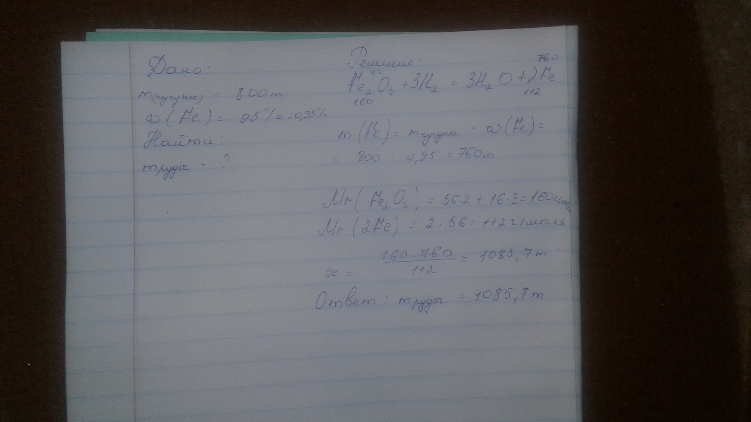 Сколько тонн руды состава Fe2O3 потребуется для выплавки чугуна массой 800т с содержанием железа 95%?