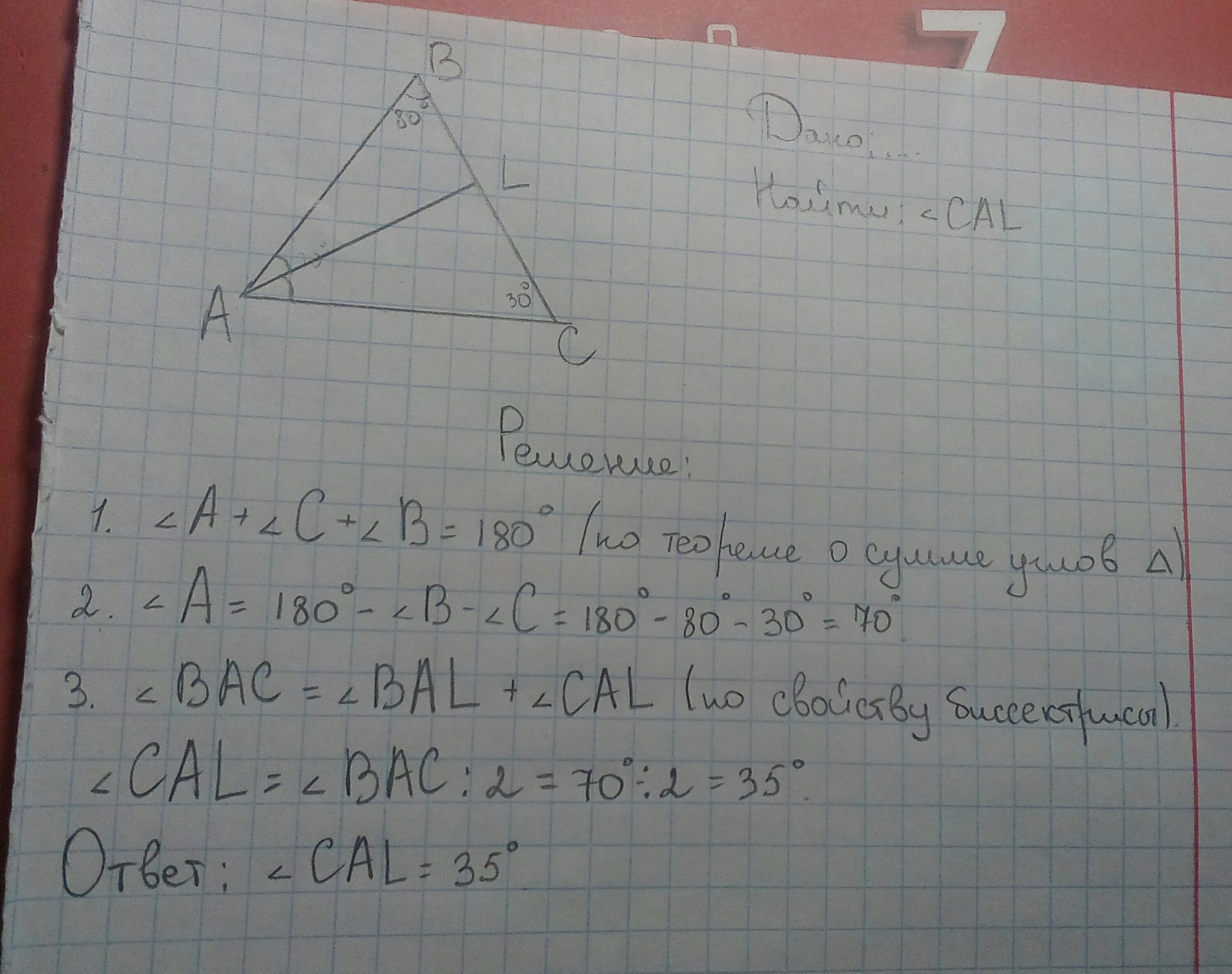 В треугольнике ABC проведена биссектриса AL. Угол ABC равен 80 градусов, угол ACB равен 30 градусов. Найдите угол CAL.