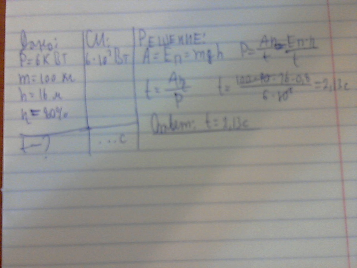 Двигатель подъёмного крана мощностью 6 кВт равномерно поднимает груз массой 100кг на высоту 16м. Определите время подъёма,если КПД крана 80%.