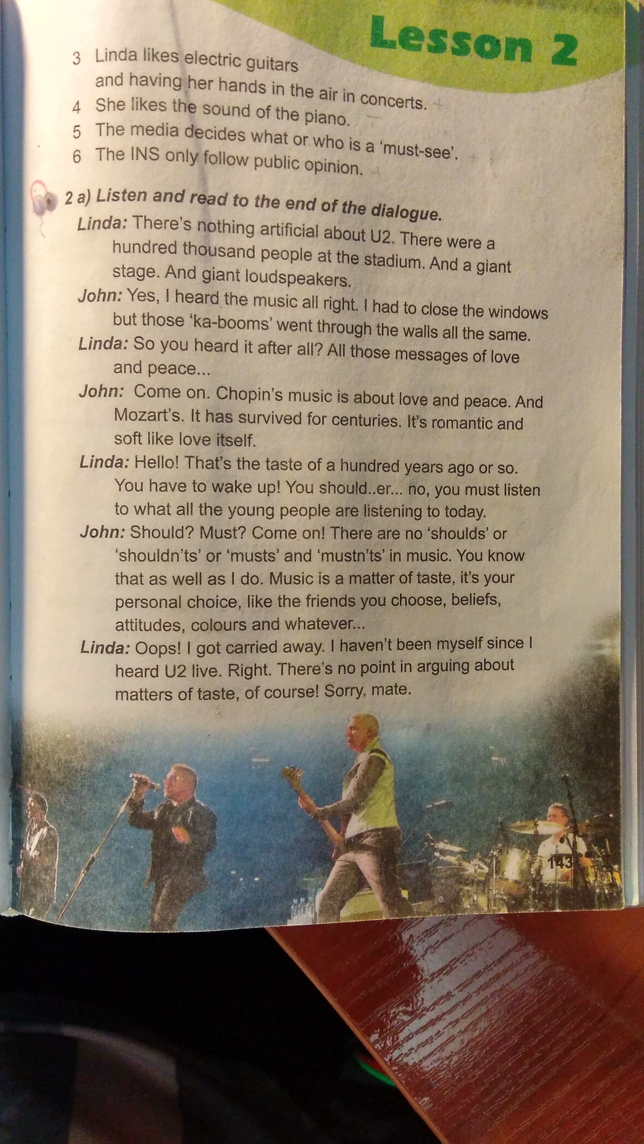 2 а) Слушайте и читайте до конца диалога. Линда: В U2 нет ничего искусственного. На стадионе было сто тысяч человек. И гигантский этап. И гигантские громкоговорители. Джон: Да, услышал музыку. Мне пришлось закрыть окна, но эти «ка-боны» прошли через стены. Линда: Значит, ты это слышал? Все эти послания любви и мира ... Джон: Давай. Музыка Шопена - это любовь и мир. И Моцарта. Он пережил на протяжении веков романтичный и мягкий, как сама любовь. LInda: Привет! Это вкус сто лет назад или около того. Вы должны проснуться! Ты должен .... нет, вы должны слушать, что все молодые люди слушают сегодня. Джон: Должен ли? Должен? Давай! В музыке нет «snoulds» или «shouldn'ts» или «musts» и «mustn'ts». Вы знаете, что так же, как и музыка, это вопрос вашего вкуса, это ваш личный выбор, как ваши друзья, убеждения , отношения, цвета и все такое ... Линда: Ой, я увлекся, не был собой, так как я слышал, что U2 живёт. Правильно. Разумеется, нет смысла спорить о вопросах вкуса!