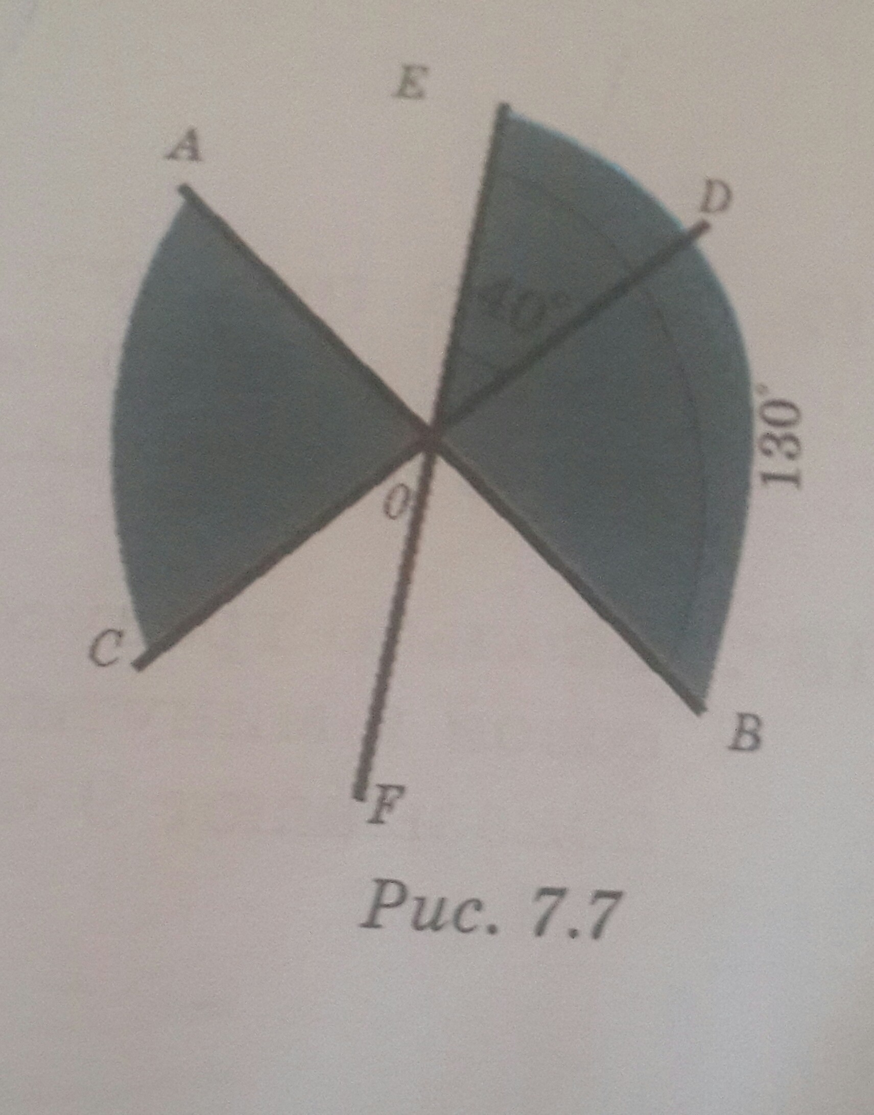 На рисунке 7.7 углы ЕОД=40 градусам, а угол ЕОВ=130 градусам. Найдите градусную меру угла АОС.
