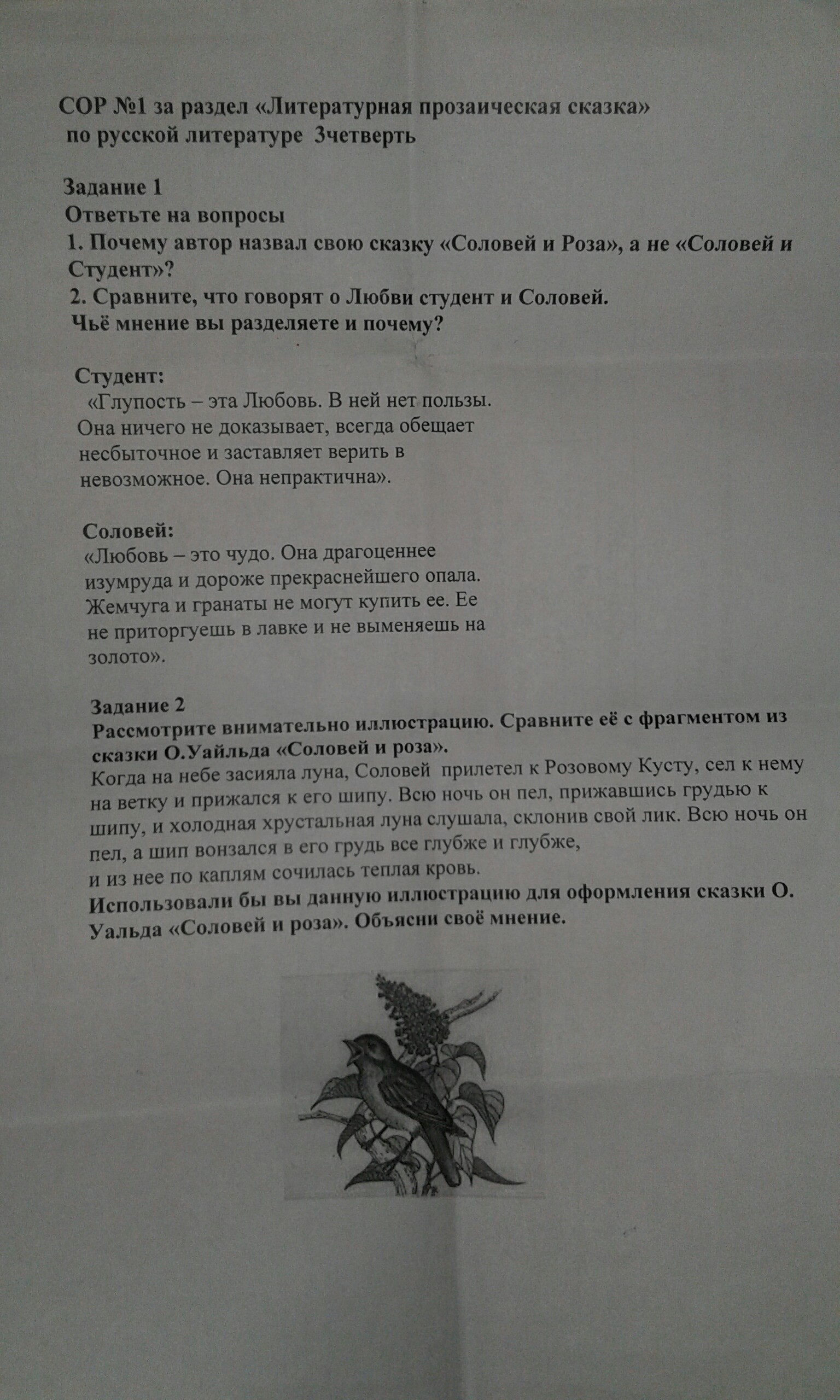 2 задание Я бы не использовала данную картинку потому что в сказке соловей и роза говорится что соловей сел не на сирень а на розу.